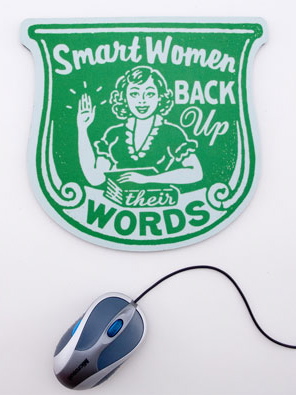 Note: although this, like other mousemats, is now discontinued and a technological antique: the message still stands, re. the backing up of words. Also, smart women are neither antiques nor discontinued.