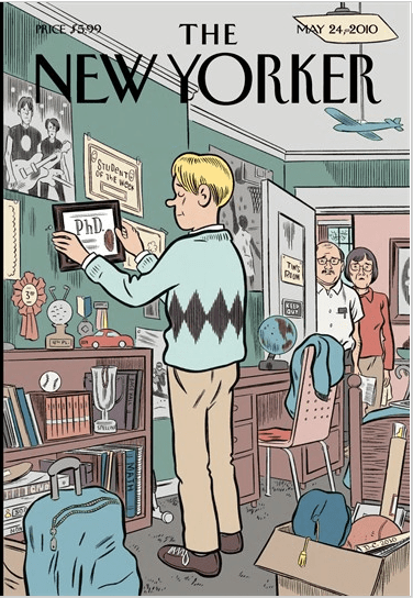 Second reaction was sadness and sympathy. Because, like any good cartoon, it’s true. Not universally true, of every PhD. But of some. And I’ve seen that look on many parents’ faces: parents of undergraduates, parents of fellow graduate students, and my own parents. It must be troubling and unhappy to be a parent of that generation nowadays: that generation that had job security, jobs for life, linear careers, structure. A generation that worked, bought houses, all in the appropriate linear progression. My own parents have accused me of mocking and sneering at their values; though we have more in common than not. And it takes many years, many arguments, and much work on both sides to reach some kind of understanding, that’s also an understanding by each side of what the other’s world is, and how these worlds and times are different. Not necessarily better or worse–there’s much that’s bad in 1950s values as concerns women, for instance–just different.