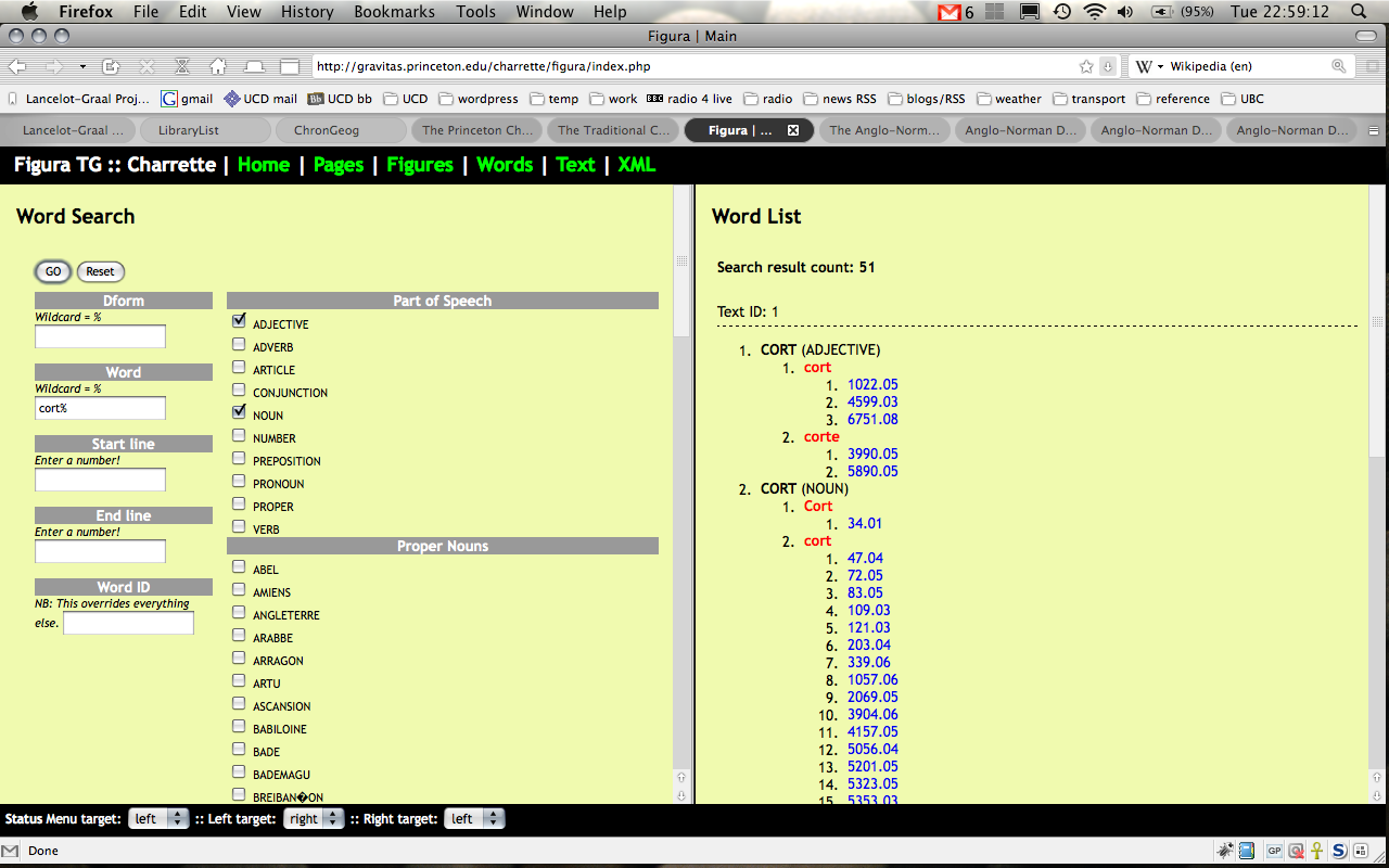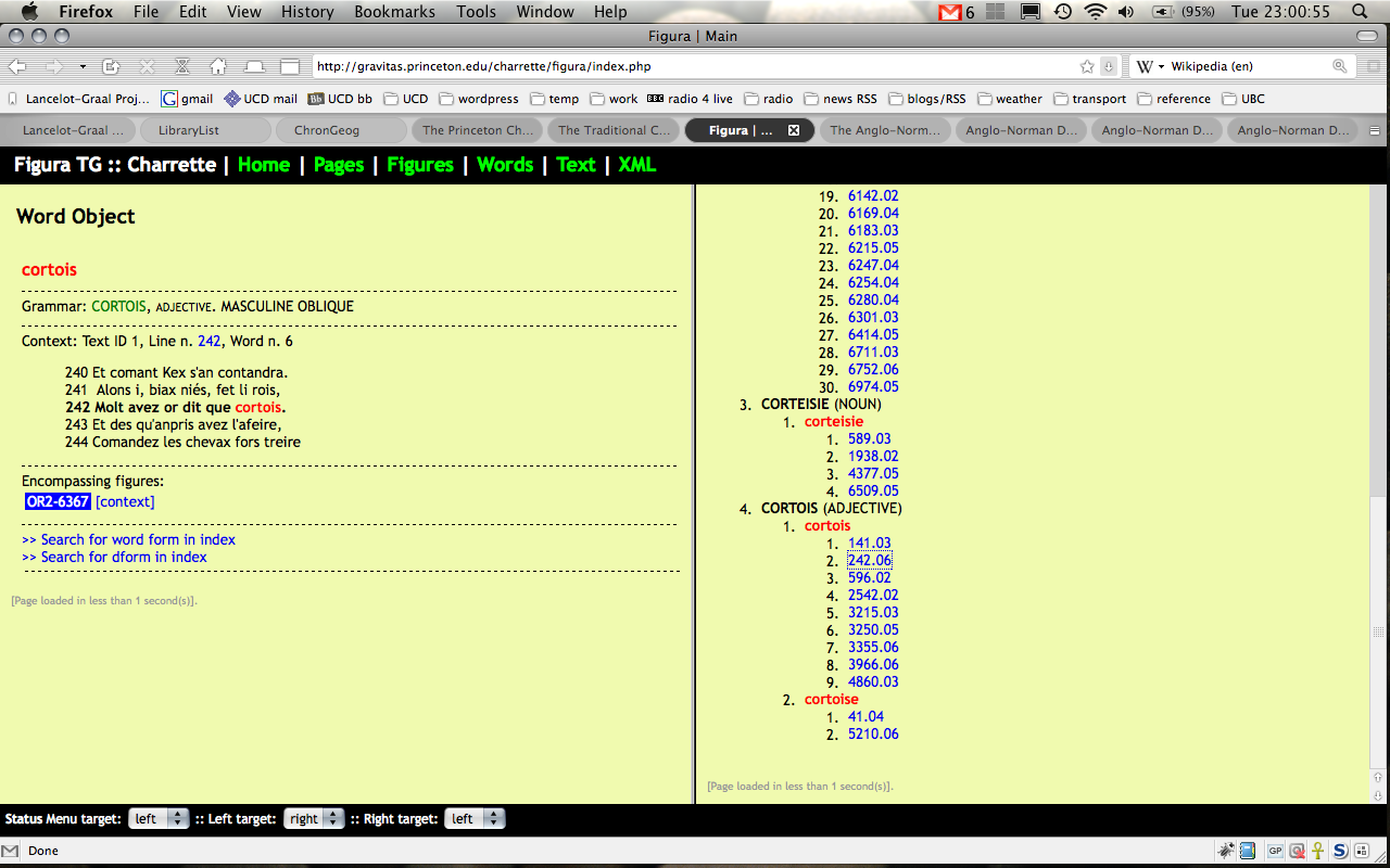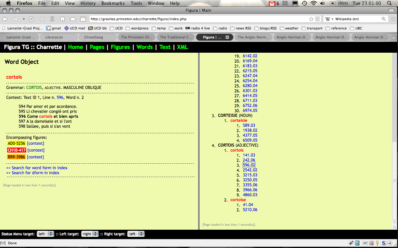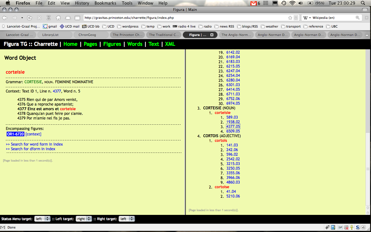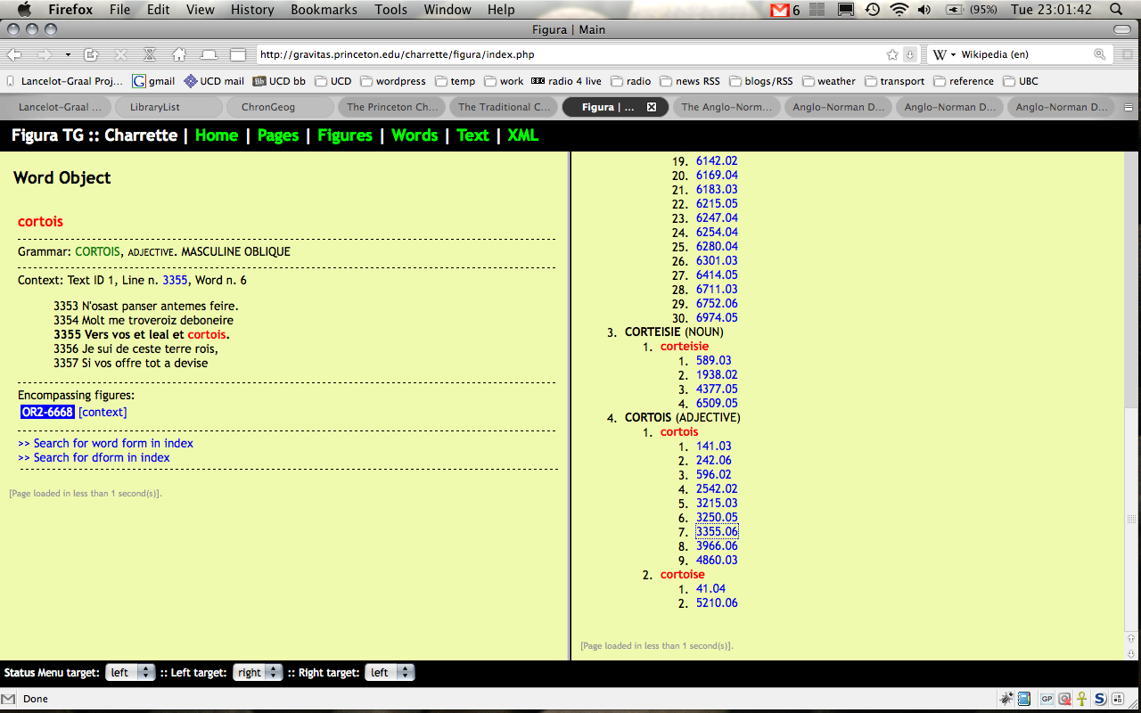 The second move is world-wide: nearly thirty years’ work in electronic philology and the digital humanities. I first met this phenomenon while working on the Princeton Charrette Project as a doctoral student (on the grammatico-lexical and adnominatio databases); and have also used the Anglo-Norman Dictionary and the CD-ROM (alas, neither online nor free) Concordance of Medieval Occitan. I should also mention the medieval linguistics and literature laboratory run by the CNRS in conjunction with the ENS at Lyon. These sorts of project enable a return to, well, good old-fashioned close reading, in a way that is very much closer precisely because it is “assisted.” And this is where we move back to Chrétien de Troyes, for the very end of the talk: because –aside from this idea of courtly love – there is actually some evidence for it in his works, including the Charrette: