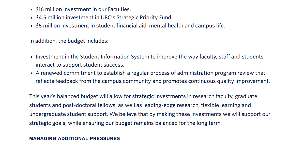 - “The 2015/16 budget includes more than $6M reallocated from central administrative units on the Vancouver campus, to be used to support our Faculties and facilitate strategic investments. This shift provides greater support to the academic mission of the University, including research and learning.”
