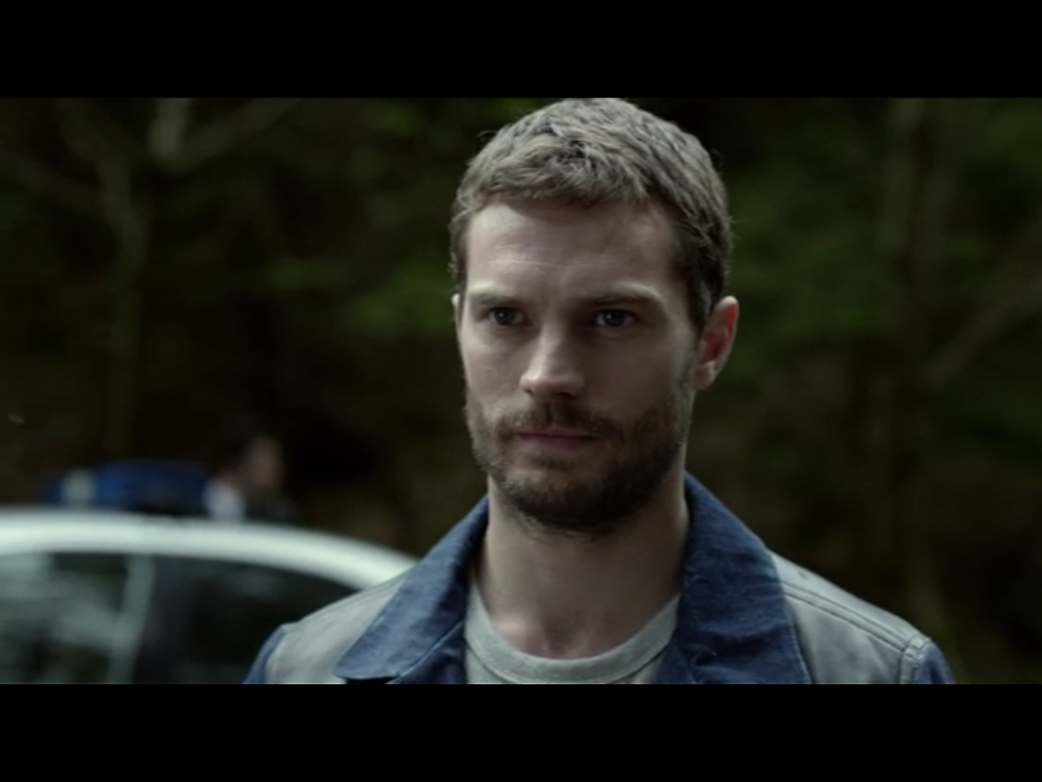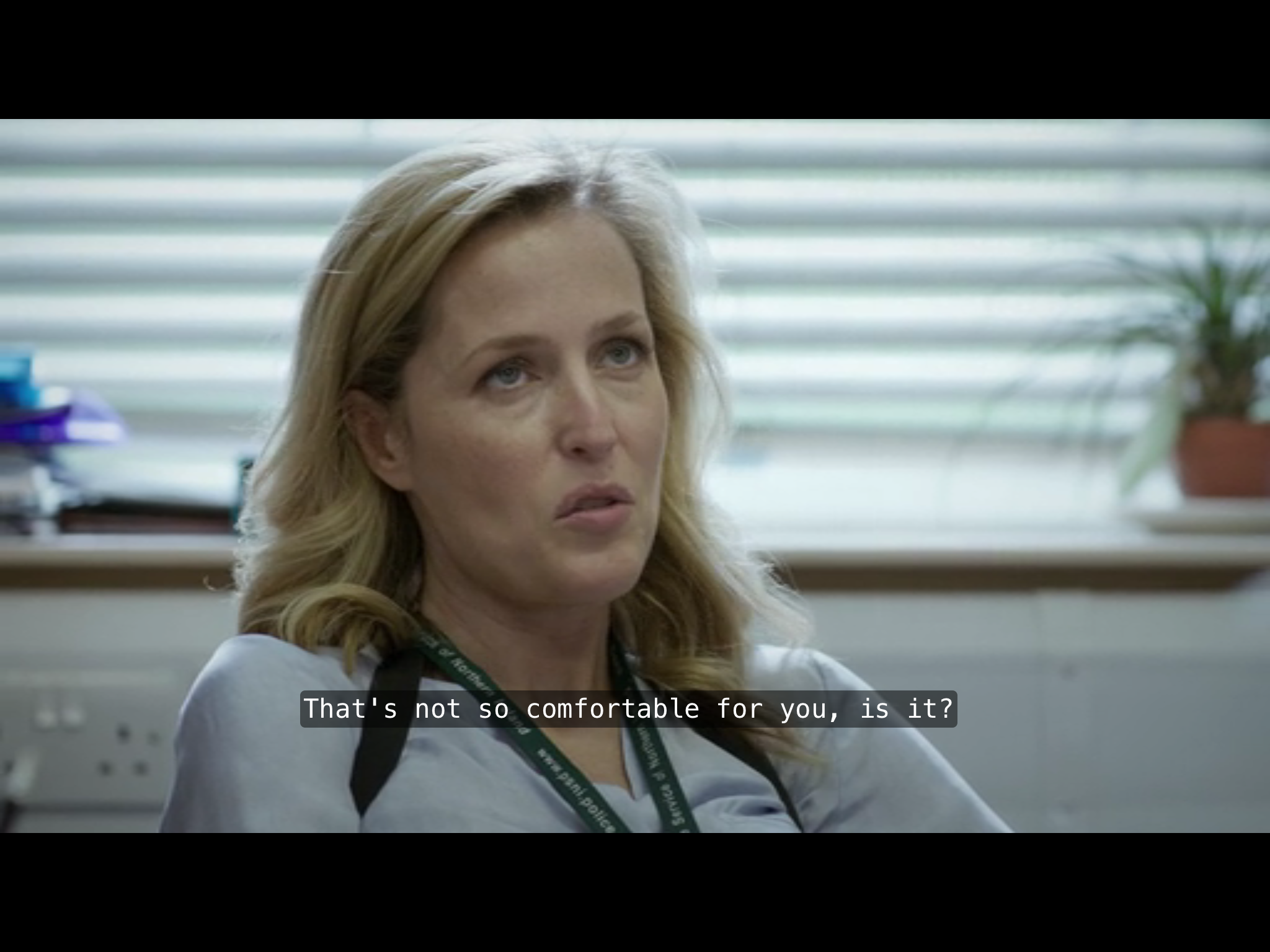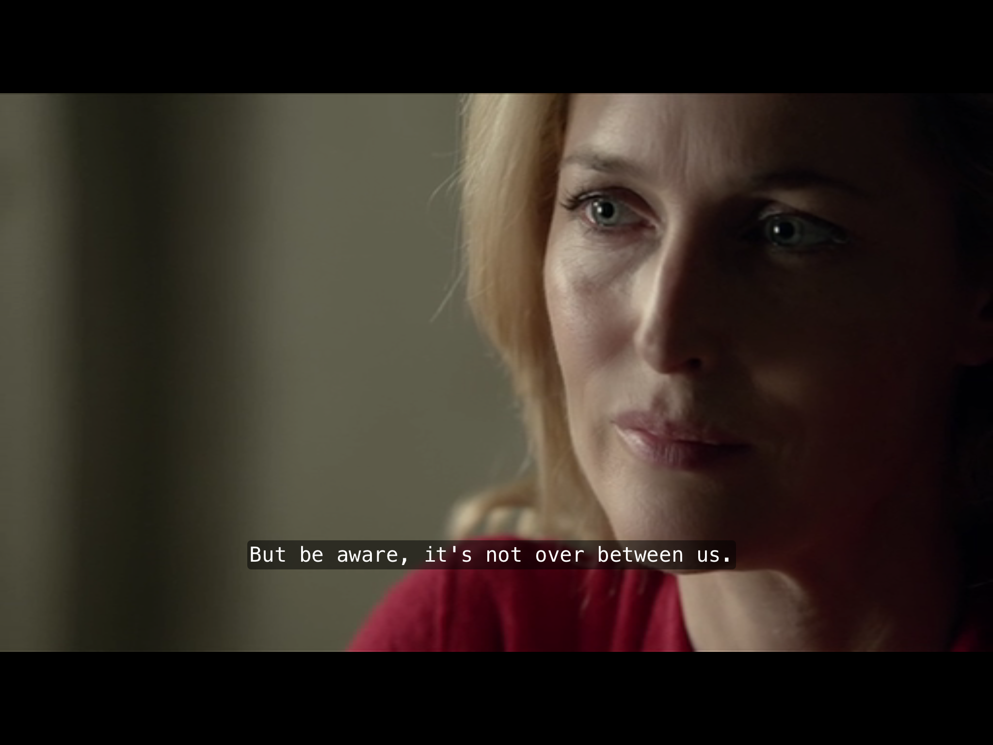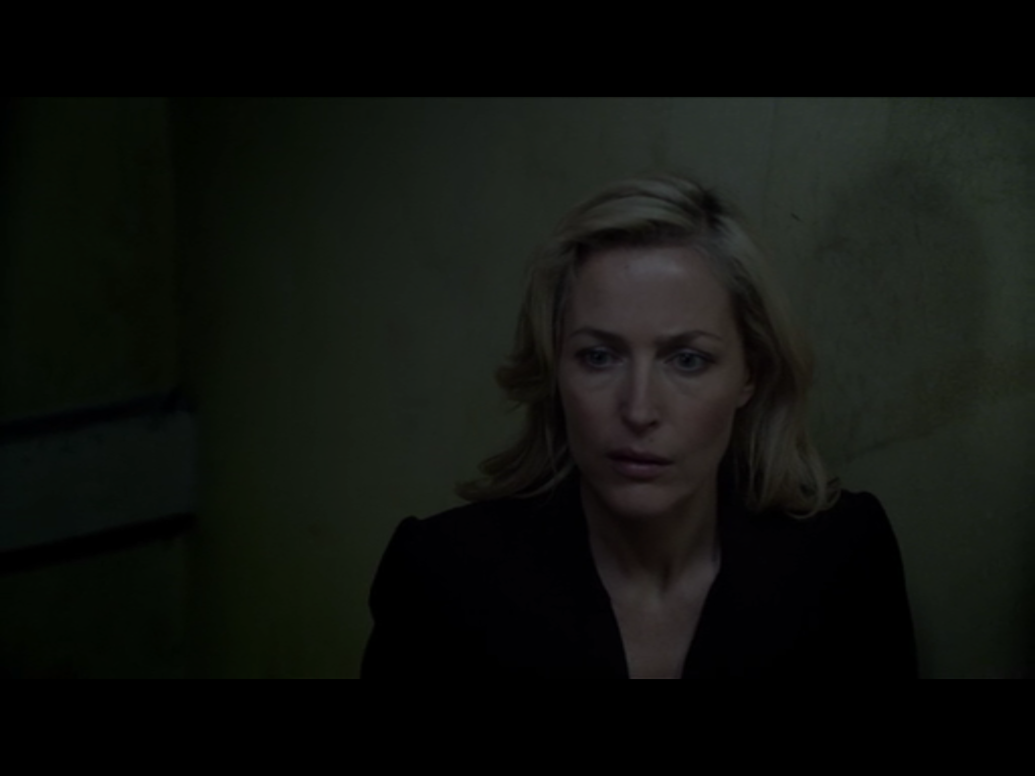 Gazing more: while there’s a lot, and a lot of clever stuff, in The Fall about gender issues, and some gazing and perception, it’s far from the old Lacanian Male Gaze turkey. Our two principals both have eyes of that interesting sort of changeable grey that includes other colours. So besides the expressive effects of pupil dilation and contraction and the use of facial muscles around the eyes, as usual with any eyes, we have extras. These eyes can be anything from icily emptily crystalline to murkily opaque; with intermediate stages through progressive lightening and darkening, greening and warm golding, lucid clarity and interest. They look like they’re constantly observing and analysing, yet are hard to read. As with the interview-scene, there’s a lot of non-verbal internal reading going on, isolating the two of them in a private shared world.