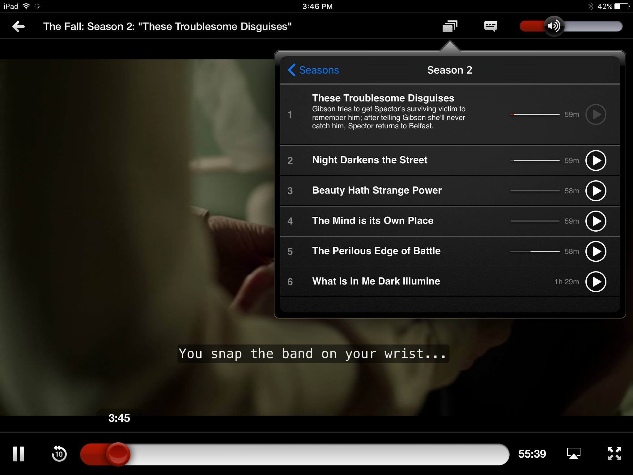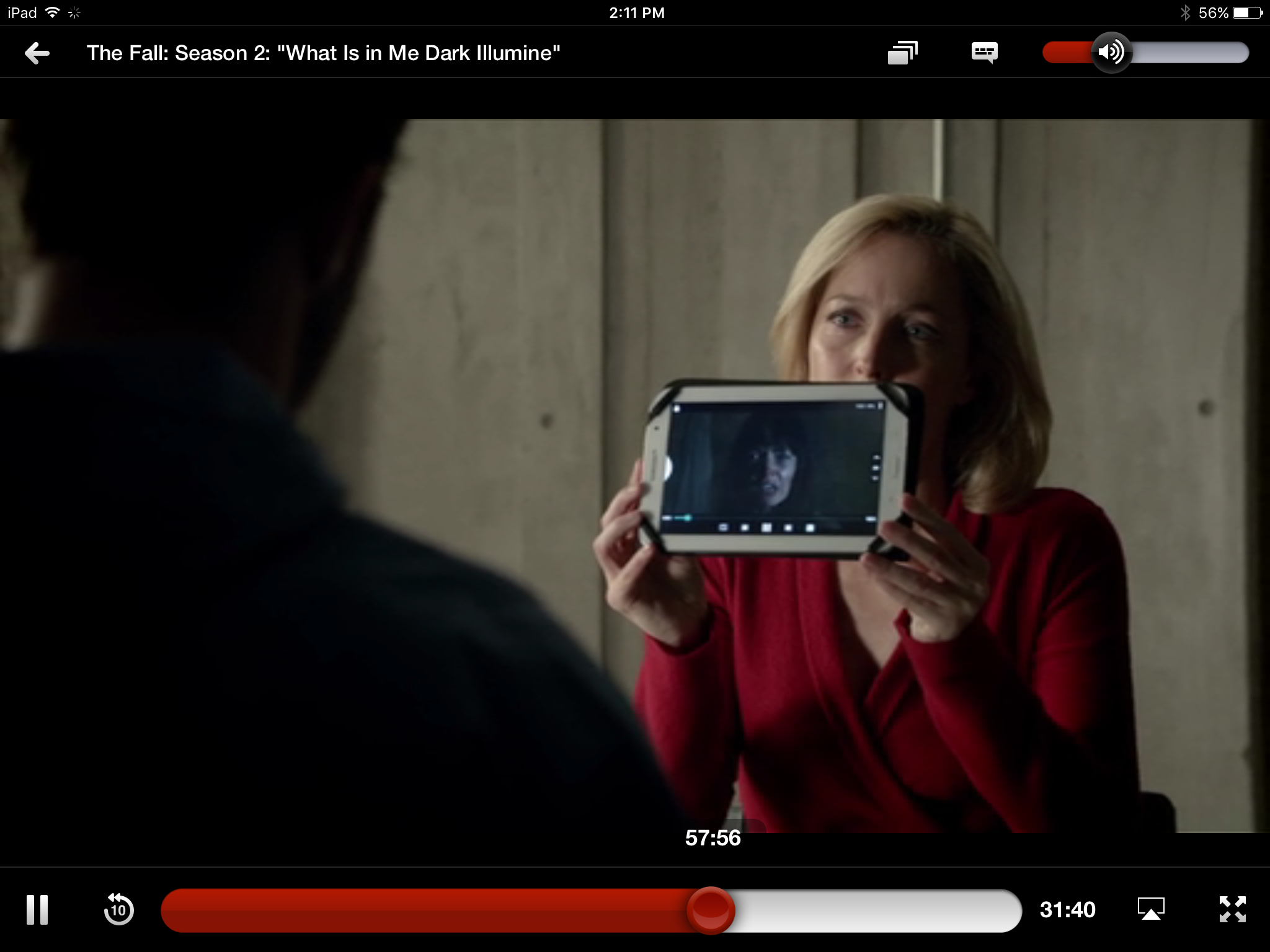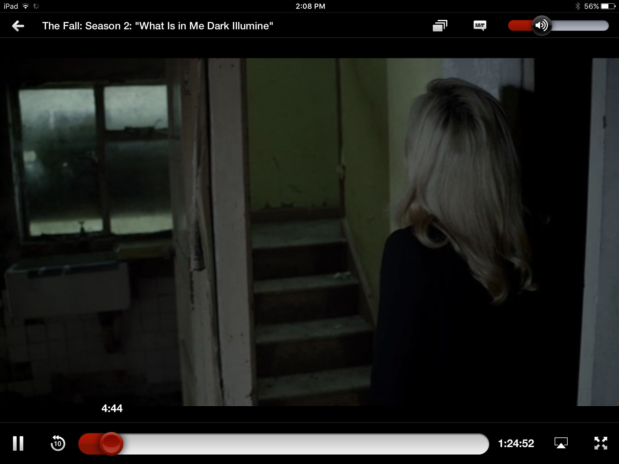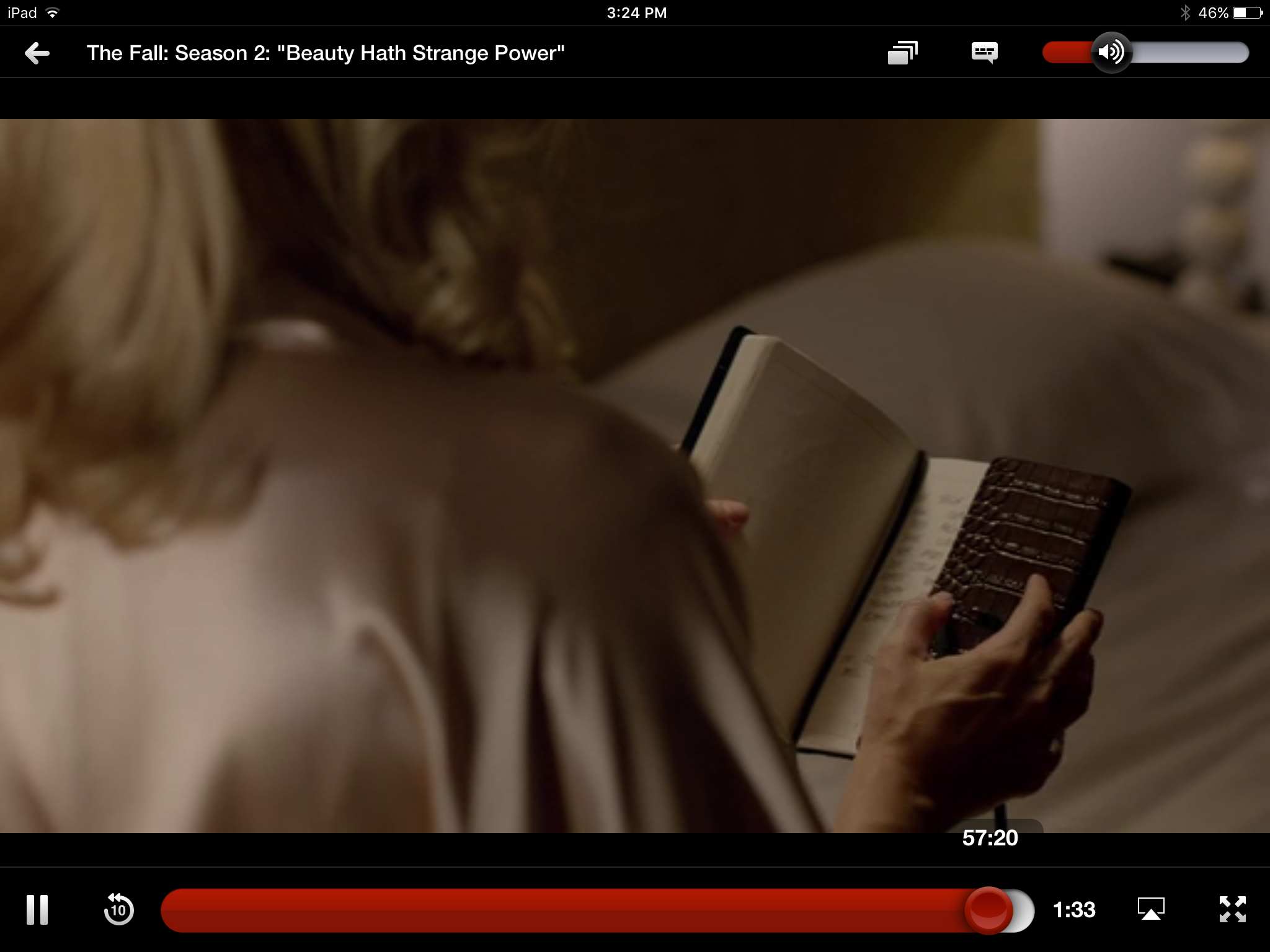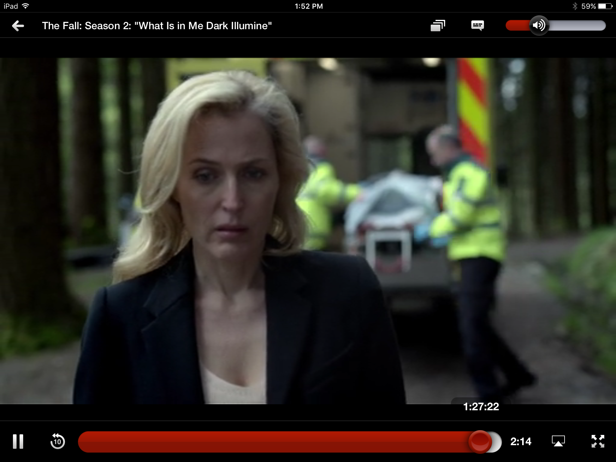 Gazing more: while there’s a lot, and a lot of clever stuff, in The Fall about gender issues, and some gazing and perception, it’s far from the old Lacanian Male Gaze turkey. Our two principals both have eyes of that interesting sort of changeable grey that includes other colours. So besides the expressive effects of pupil dilation and contraction and the use of facial muscles around the eyes, as usual with any eyes, we have extras. These eyes can be anything from icily emptily crystalline to murkily opaque; with intermediate stages through progressive lightening and darkening, greening and warm golding, lucid clarity and interest. They look like they’re constantly observing and analysing, yet are hard to read. As with the interview-scene, there’s a lot of non-verbal internal reading going on, isolating the two of them in a private shared world.