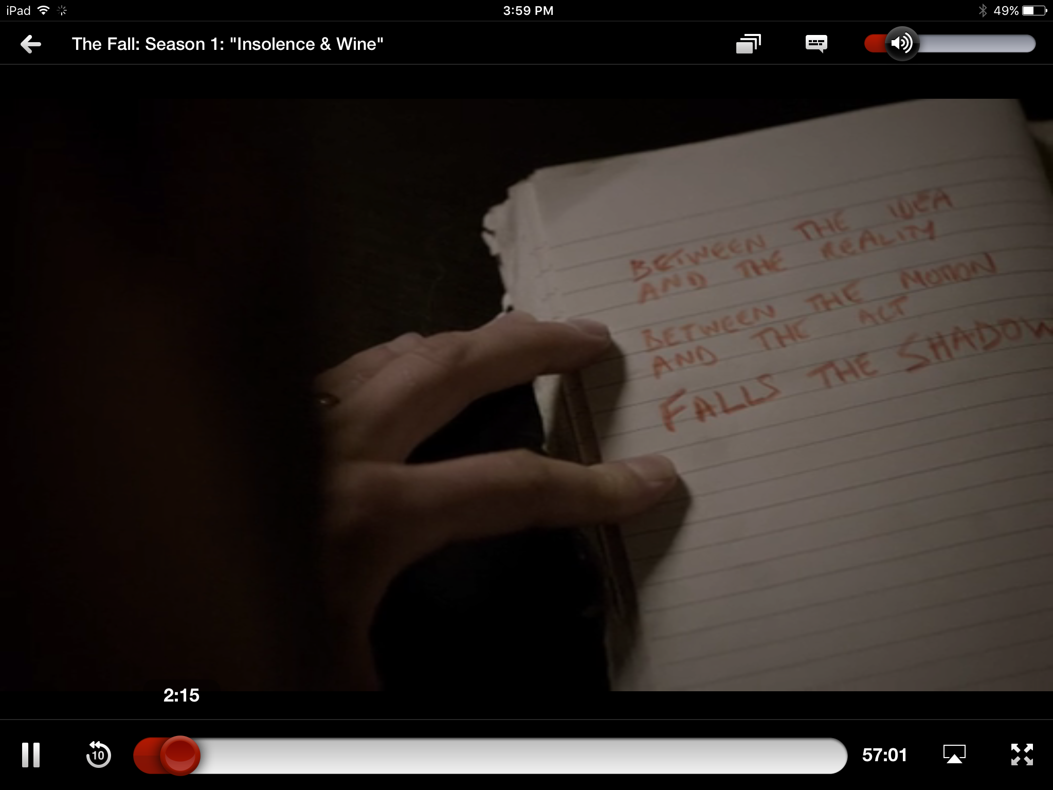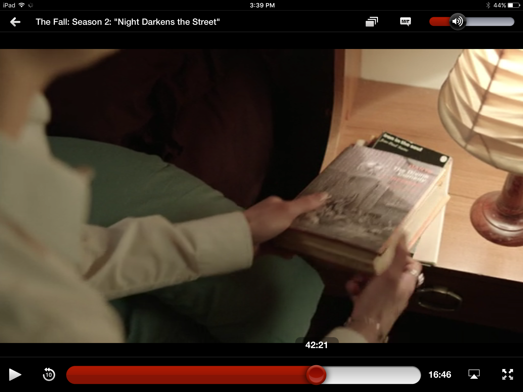 The book at the bottom of the pile looked like a volume of poetry. I can’t see it properly but it wouldn’t surprise me if it’s The Wasteland. While distant and blurry, I’m sure it’s poetry: it’s thin, minimalist in outer design, and the cover looks like several standard poetry series of the 1960s-70s of a sort that a Hip Undergraduate would be able to find and buy cheaply in second-hand or charity bookshops. My reason for guessing The Wasteland? Textual evidence: given doubleness of action, Dante, and “Falls”; and given, from back near the beginning of the first series of The Fall, this:
