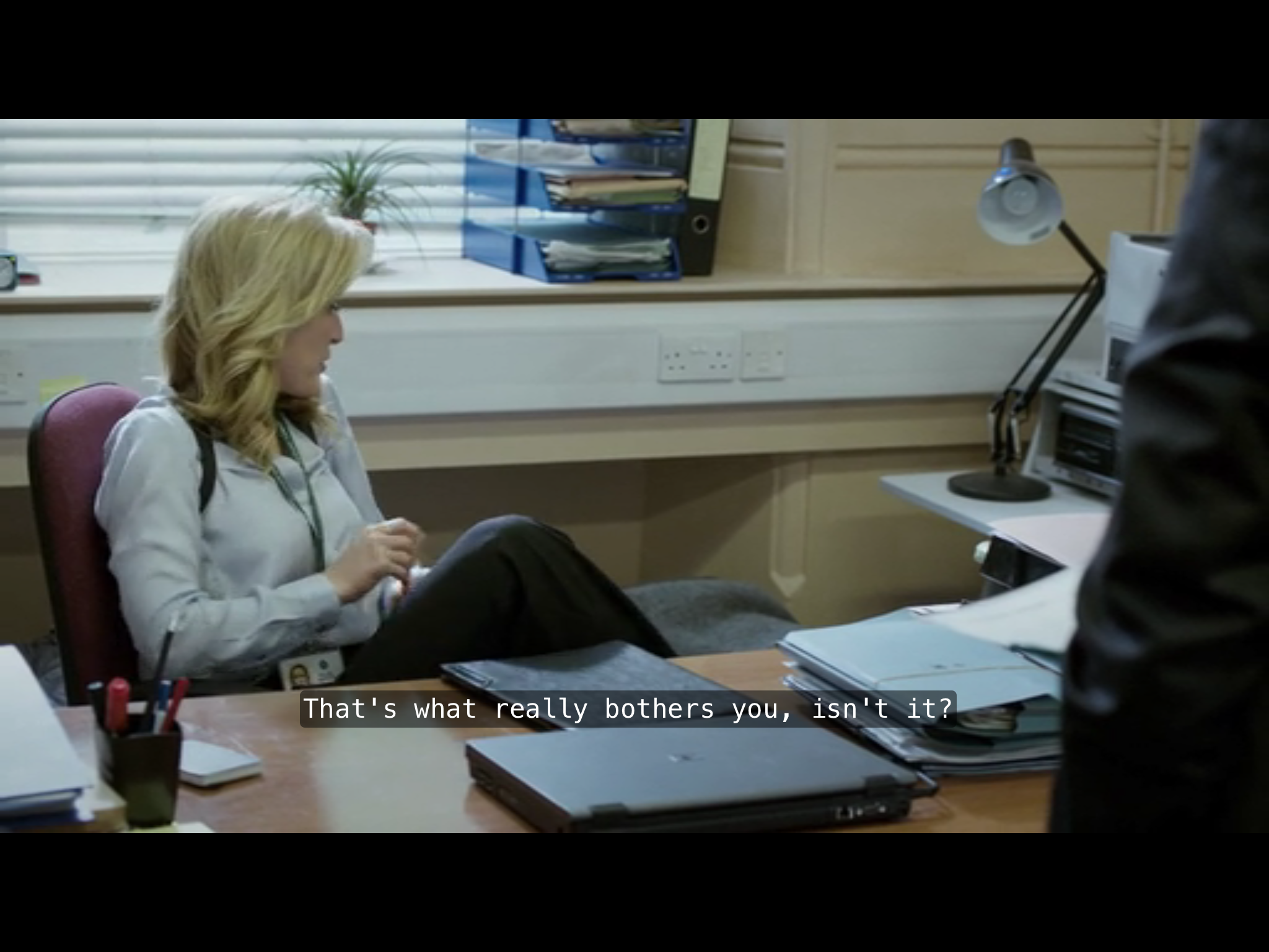 So. Back to Falling after this present post’s breakbeat mid-point. The final episode is shaped around a conversation in the middle, the moment and hinge around which the whole episode is built, with reflections and echoes in mise en abyme either side of it; rippling out through the second series and back through the first.