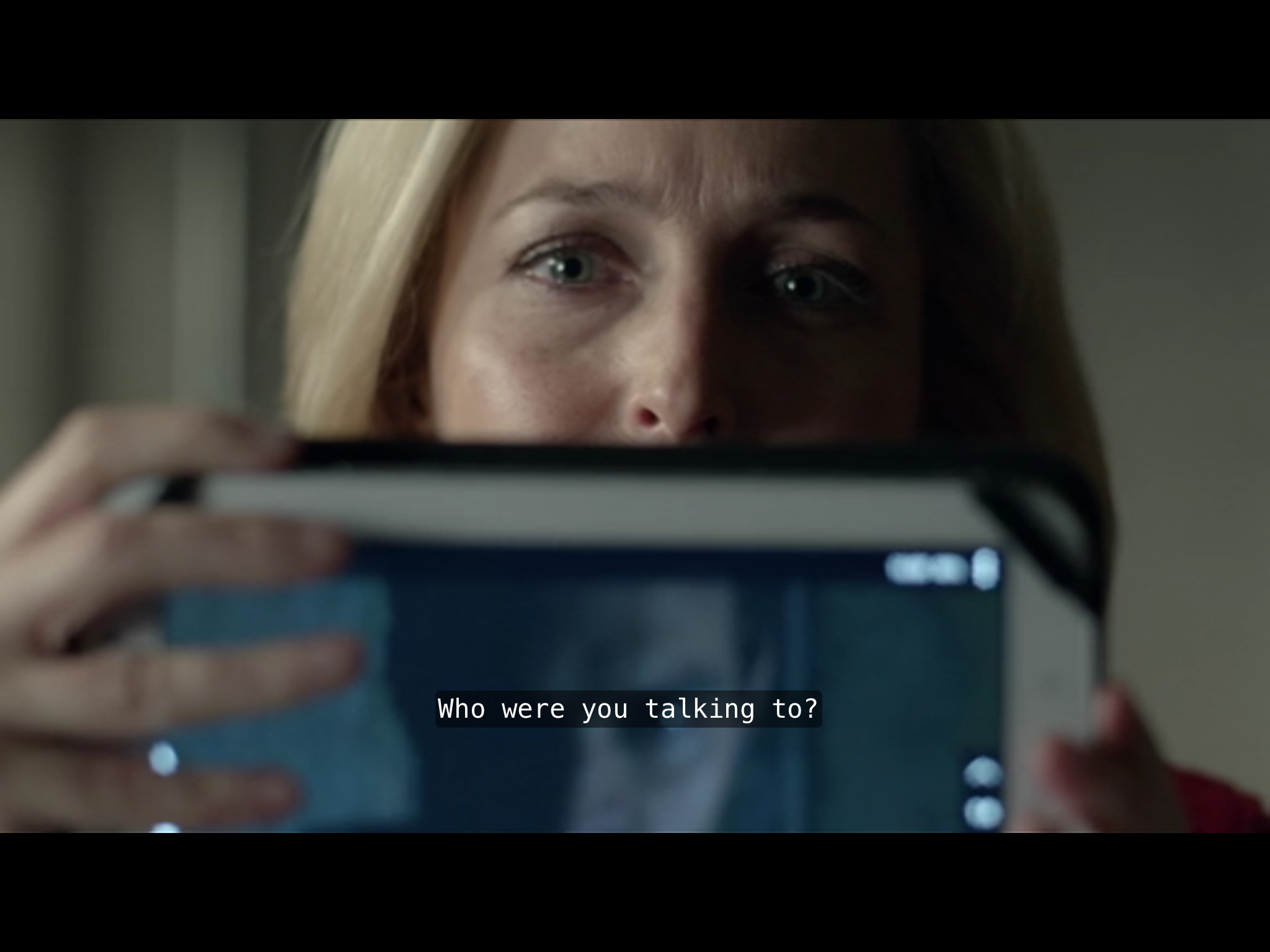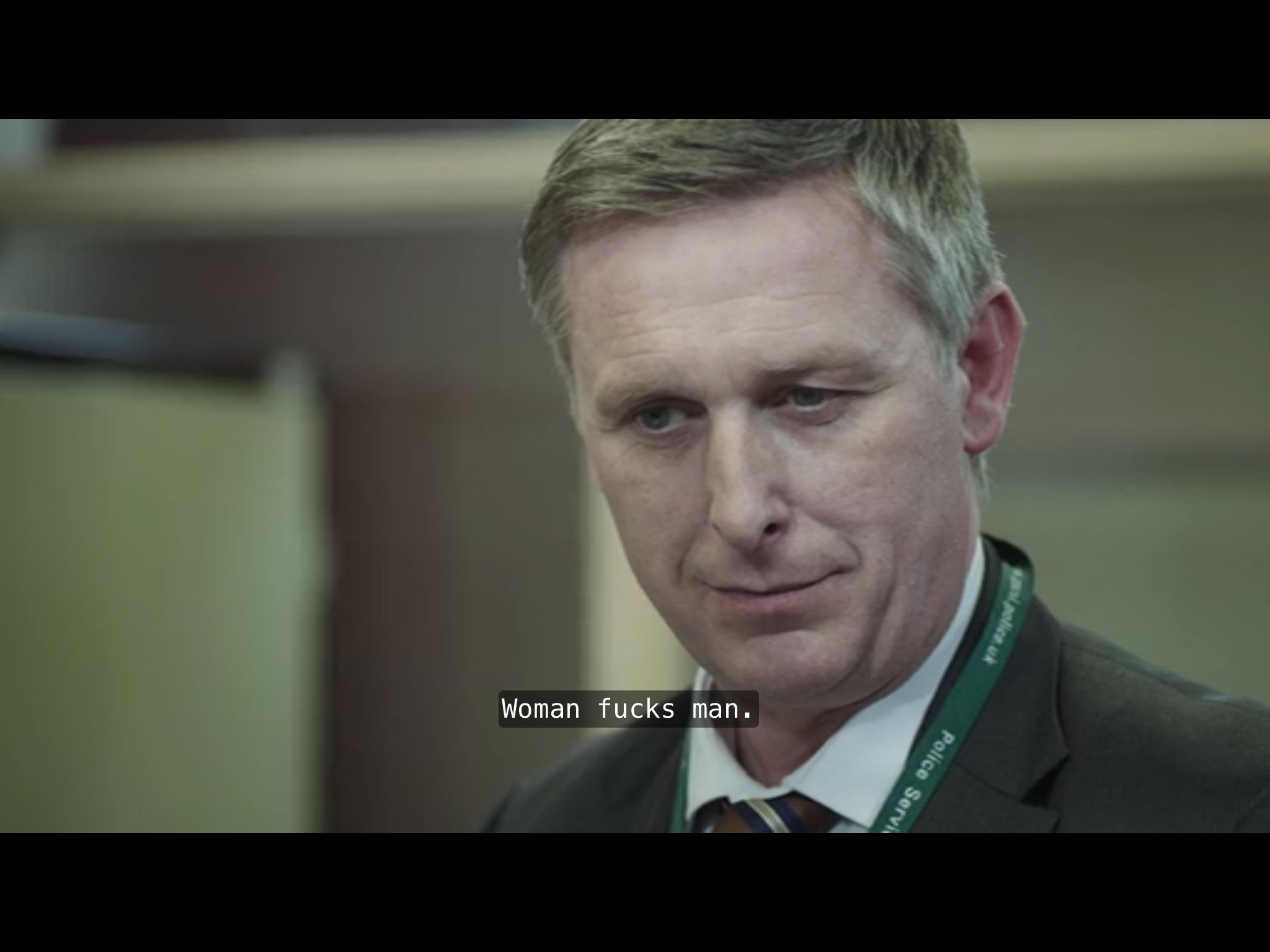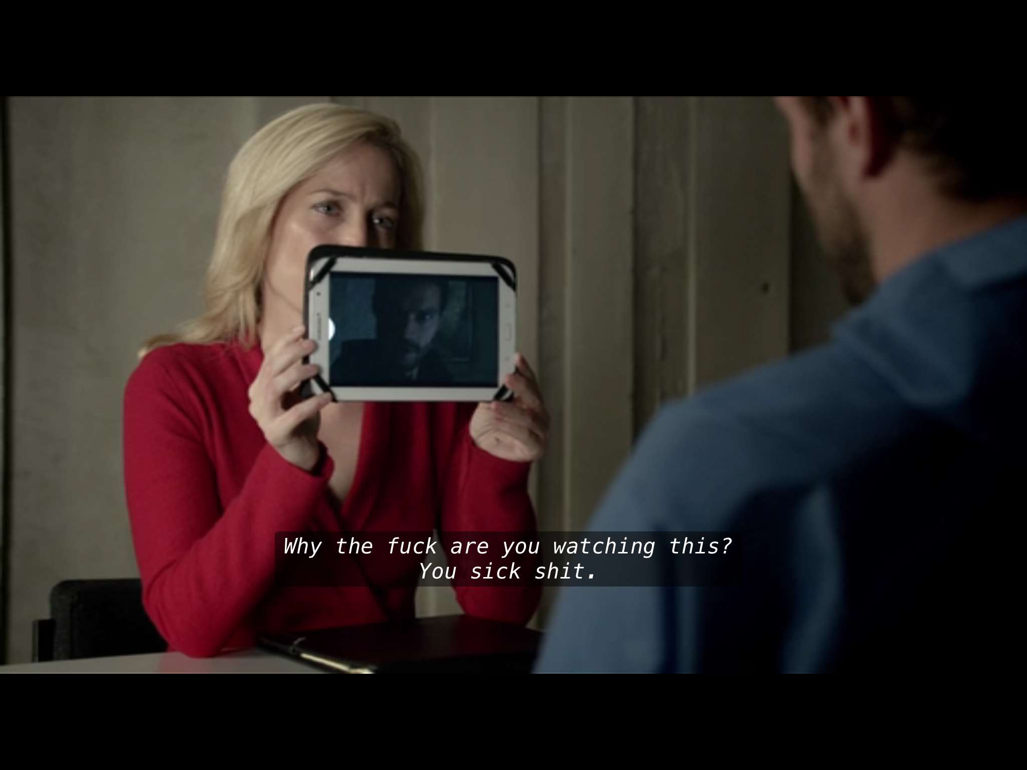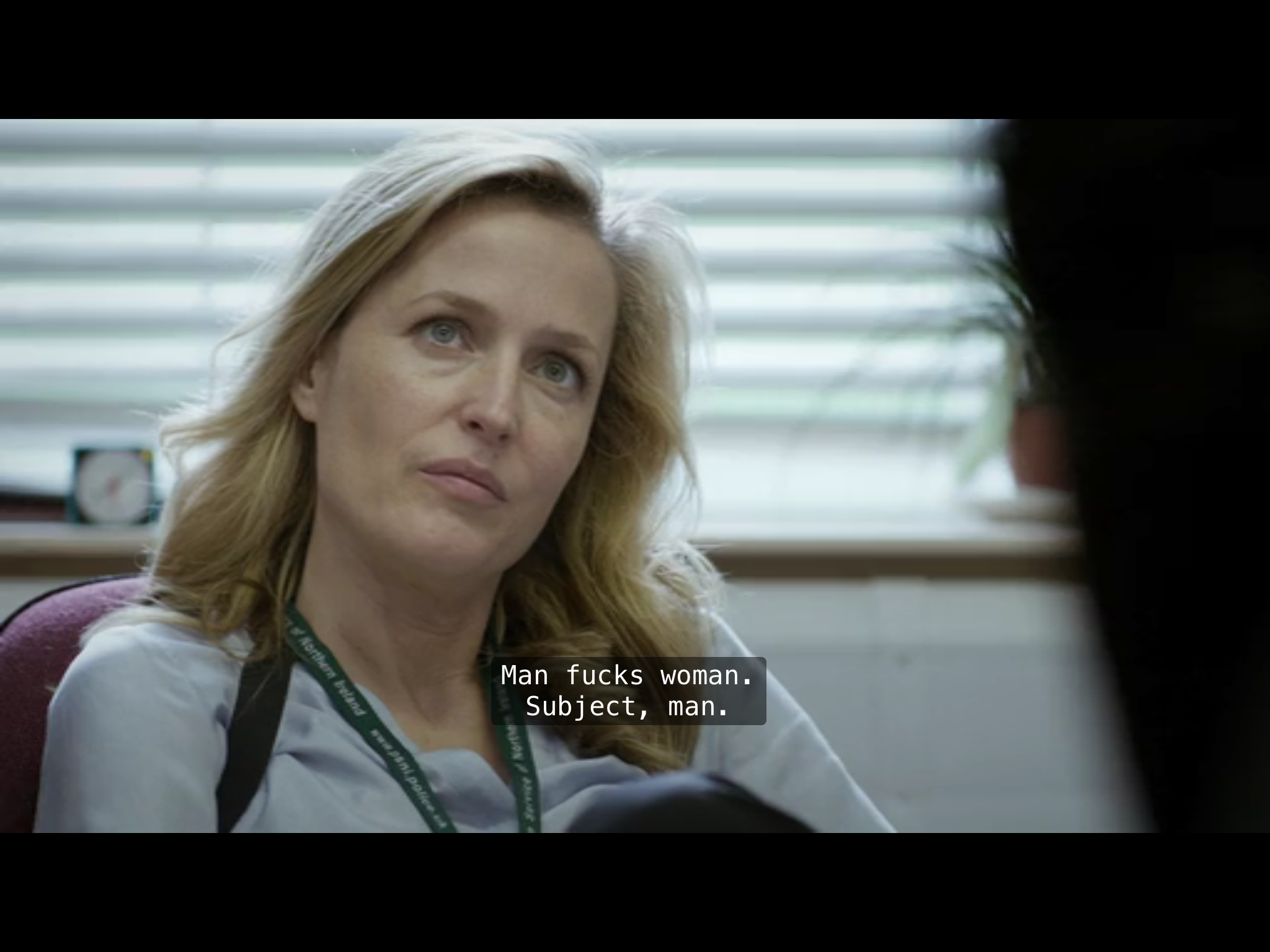 We never (I think?) see Gibson and Spector face to face, two sets of eyeballs, in classic “closing in for clinch gazing raptured into each others’ eyes” cliché, when reflexive and reciprocal verbs fuse into one, as two singular persons (real and grammatical) become one plural one; a romance trope, for example in Chrétien de Troyes. Never the equality enabled by a third-party voyeur focalisation. The nearest we will have will be this episode’s central long interview scene (more on which anon).