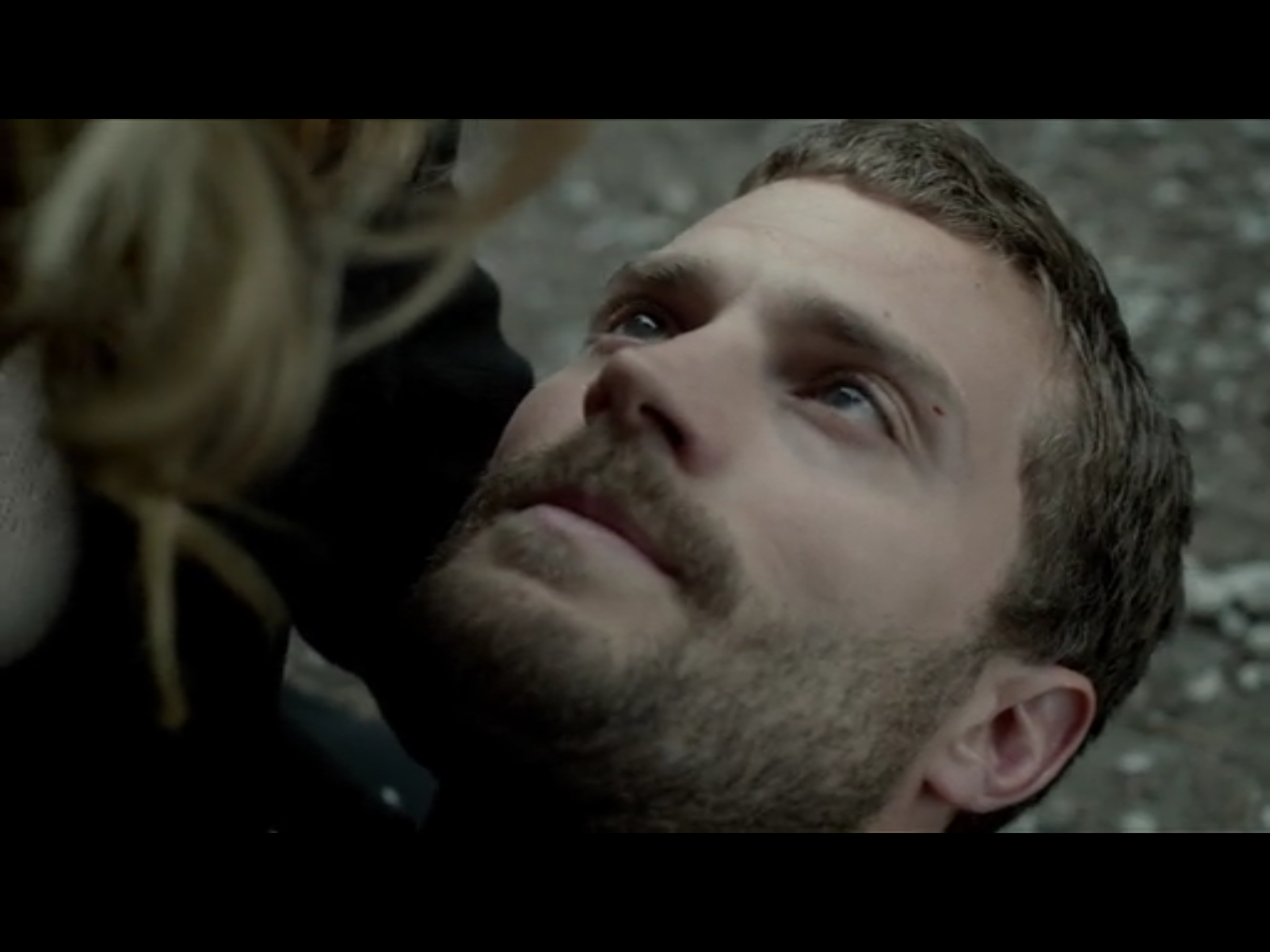 A work that adds intertextual echoes through the resonances of its actors’ other roles in other fictional worlds: most obviously to Andersen’s FBI investigator-detective in The X-Files; for some other characters and their actors, see also this next post on further intertextuality; in Dornan’s case, filming The Fall (2013-) would have preceded and overlapped with 50 Shades of Grey (2015). The key intersection is not with that masterpiece of erotica and artful manipulation, but rather with Once Upon a Time (mainly 2011, some episodes in 2012-13). Here Dornan plays a sheriff leading a hazy dreamlike existence in one world, while also being a huntsman in the fairy-land from which he has been raptured along with other inhabitants of fairy-tales (which also mix in assorted myth, legend, medieval romance, and fuzzy history; the narrative shifts between these two main worlds and some others, plus jumps back in time). Abandoned as a child, raised by wolves in the deep wild forest, he is a solitary outsider who seems amoral but has his own moral code; albeit an eccentric one, a heterodoxy incomprehensible to the orthodoxy of central normative power. In a misreading of his morality, the huntsman is later hired as an assassin. When he does not kill Snow White, he is stripped of his memory and capacity for feeling and forced into sexual service as a witch-queen’s pet. From which double imprisonment this damoiseau en détresse will be freed by a kiss taken and a kiss given by another stranger (another investigator/hunter outsider), albeit to die immediately in her arms.