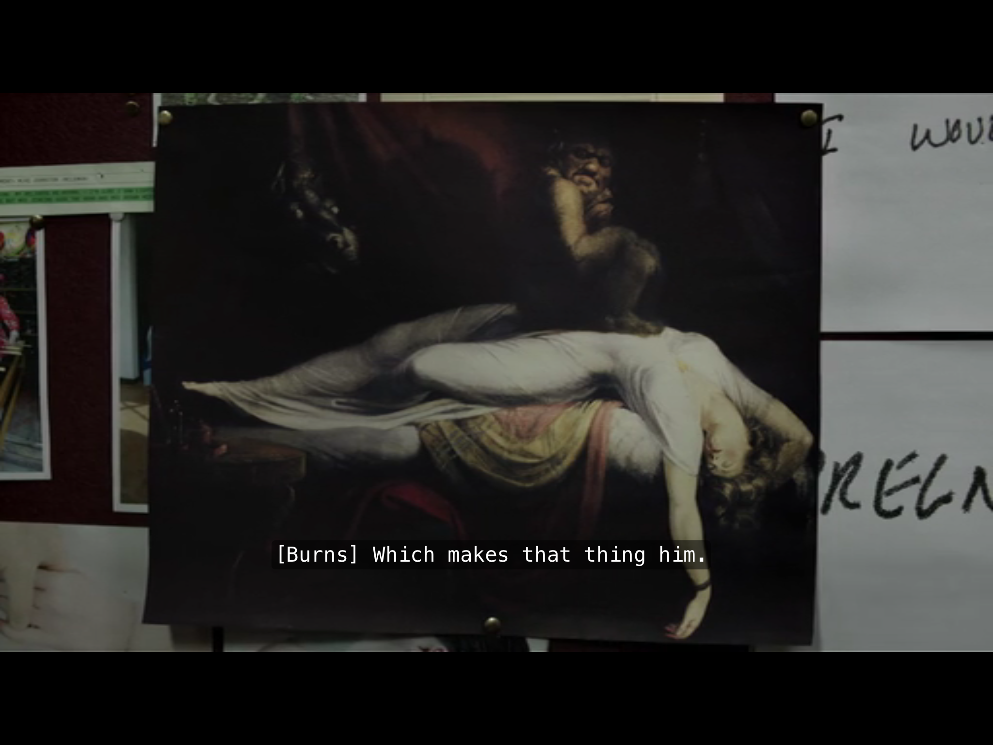Moving backwards in a first loop, that footage was first found before this episode and watched all the way through by Gibson and Anderson together. If you’re looking for an ineffable awesome transubstantiative horror that might be “sublime,” that’s your scene. It’s also when Gibson and Anderson first reach entendemen, the start of their relation. Pair that scene with this one, and the hindsight creates an expectation of Things To Come. Recouple (threesome-ify?) these two scenes with Inferno Canto V (amongst other iterations of the trope): Paolo and Francesca get together through reading the romance of Lancelot together (and end up in Hell); it’s come to that time in a series when currents are converging, the weave of threads tightens, and we’re reminded about all the senses of “falls” and of a bookish centrality of Dante (more on which anon).