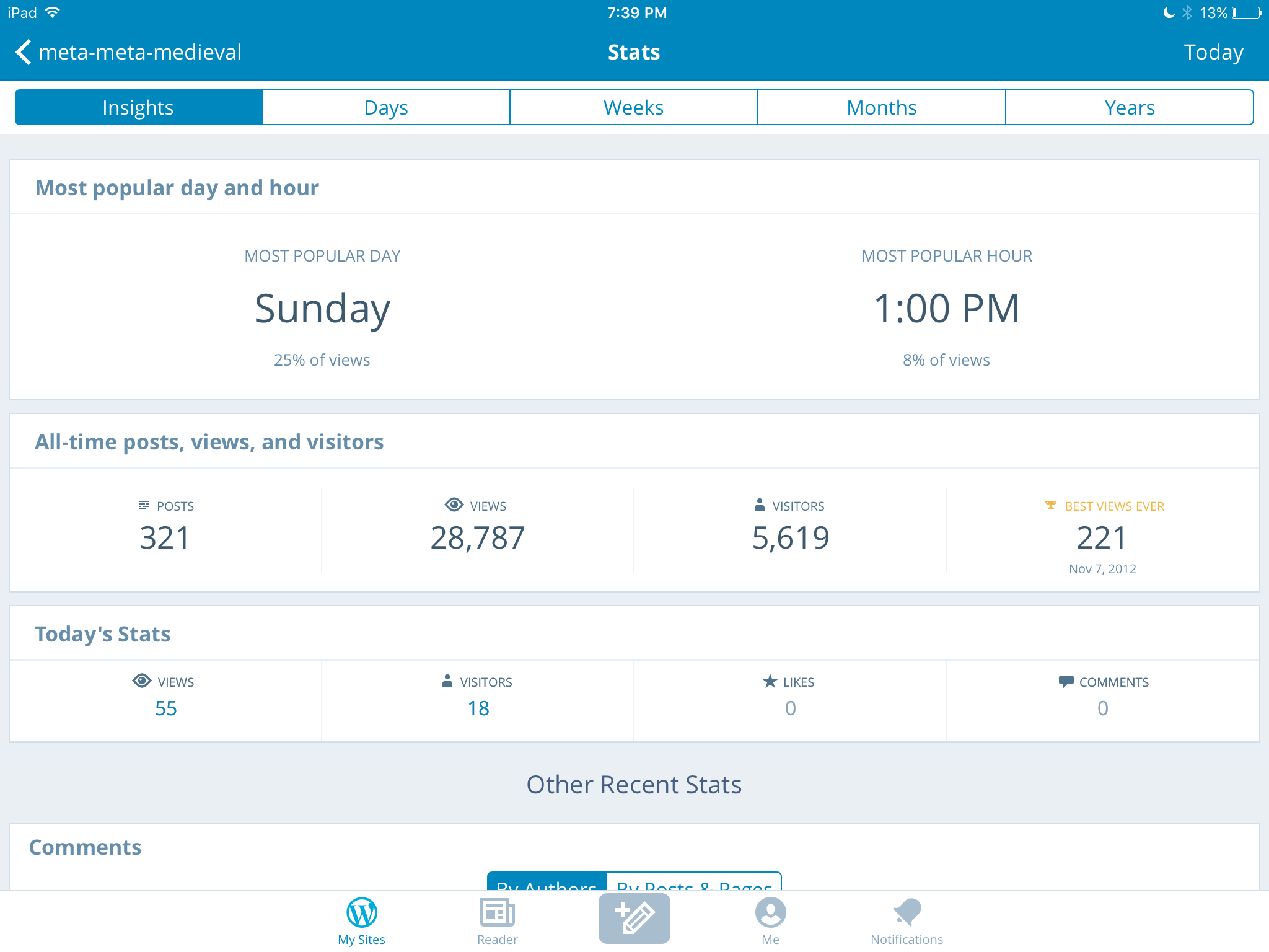 This present blog was started in 2008, as the successor to my previous “personal websites” (as they were called and considered back in the day) on other platforms (2003-2007: http://www.princeton.edu/~julietobrien, 2007-2008: http://www.iol.ie/~julietobrien) and as a place for Obrienaternal Commentary that had started to make appearances on the Forum for Medieval and Renaissance Studies in Ireland (of which I was one of the organisers, and the webmistress for its WordPress “site-that-was-not-a-site-but-made-to-look-like-one”). Earlier activity here on Meta-meta-medieval was mostly in quite short form, and re-reporting medieval and medievalist news. That started to change around 2012; there was a hiatus in 2013 (more on which in the next paragraph); and I started blogging “more seriously”–i.e. at greater length and with longer windedness–in the last two years.