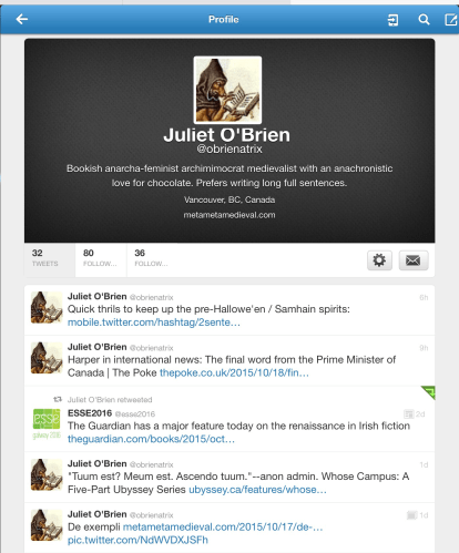 It’s got a solid past history now of use as material for larger written and multi-media creative works. For compiling and constructing curated collections: productively integrated with Flickr, Instagram, Pinterest, Tumblr, Vimeo, YouTube, and so on. To create larger collaborative collective pieces, either as is or narrativised (ex. using Storify), and Twitter is fantastic for conferences especially those with multiple simultaneous sessions (ex. ICMS Kalamazoo) or that clash with one you’re at (ex. BABEL Toronto last weekend vs. the UBC Medieval Workshop here in Vancouver). It’s fascinating to see how short writing turns into long writing–and vice versa–and moves around in curves and loops in between and before and after; thinking here about the curviness and dimensionality of writing, akin to non-linearity in reading. Thinking as ever about medieval romance; how it ticks, how it’s put together, how it’s made; and how those three things are distinct but connected.