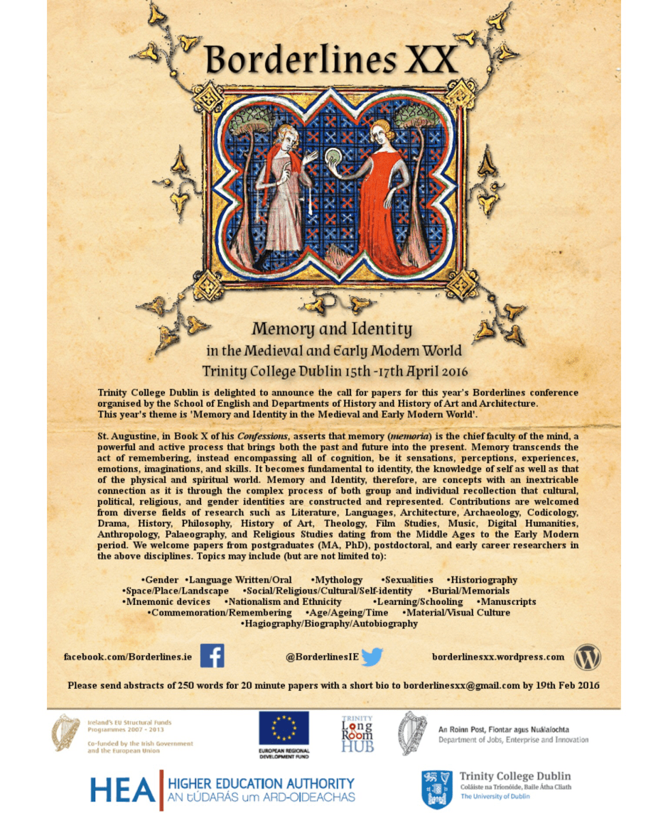 Borderlines is an annual postgraduate conference for early-career researchers in the fields of Medieval and Early Modern studies. Borderlines is held on a rotational basis between Belfast, Cork and Dublin.