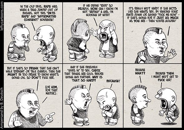 OK. Back to the simple question: why rape? Why would consent be a difficult concept to understand? I mean, the dehumanising abusive attitudes of rape apologists and butt-hurt whingeing about assaults on men’s rights doesn’t seem to have a parallel in other offences against the person: an absolute right to one’s own pleasure, the unalienable freedom to beat people up, stab them, carve them up to create extra orifices into which to insert objects, and otherwise torture and mutilate them without their consent. Or to murder them.