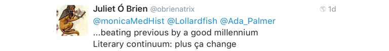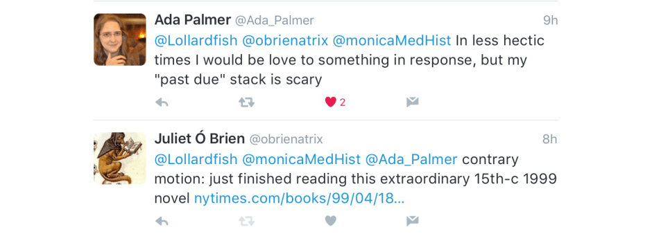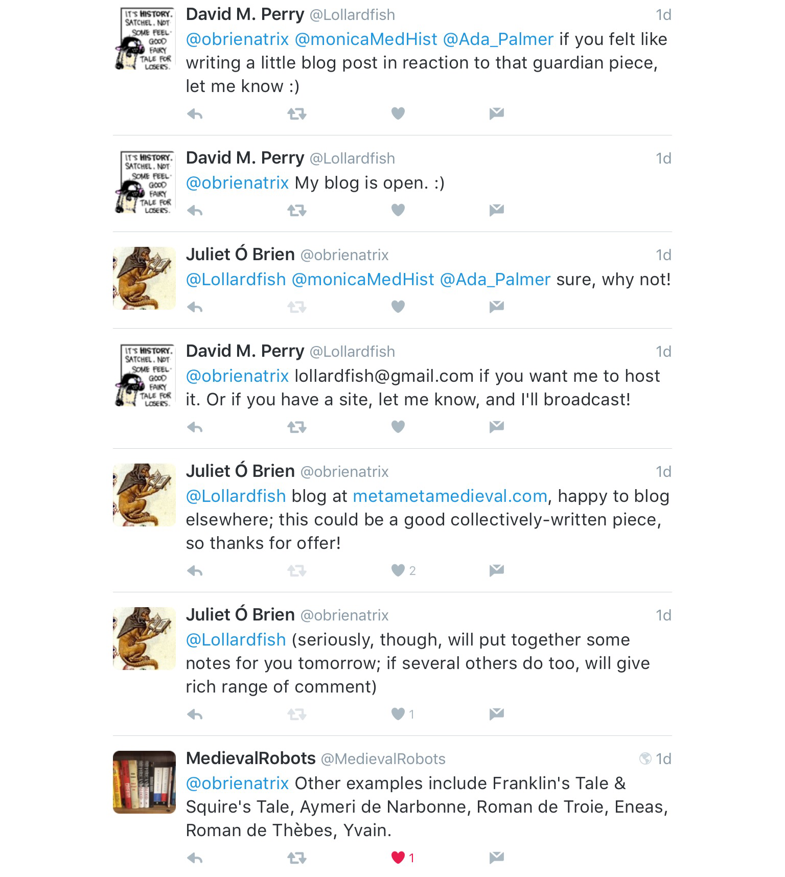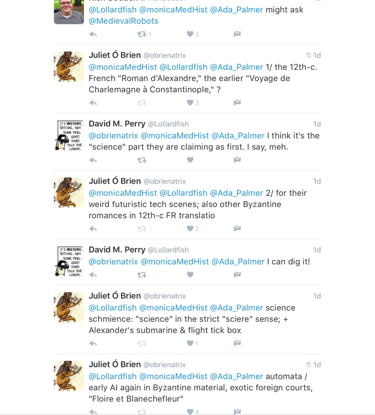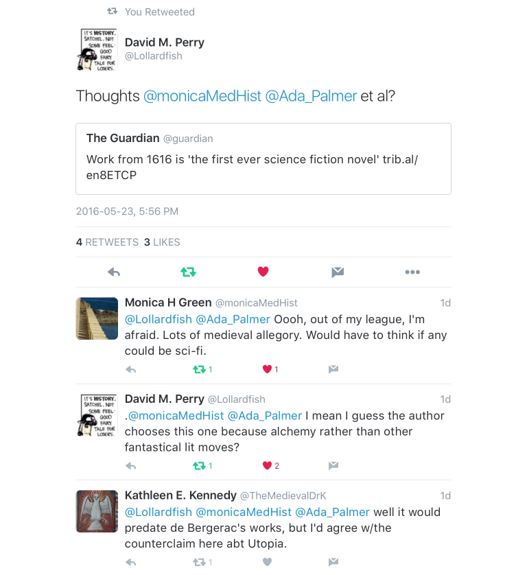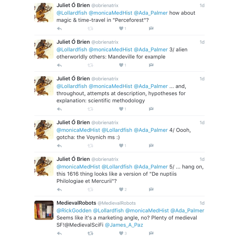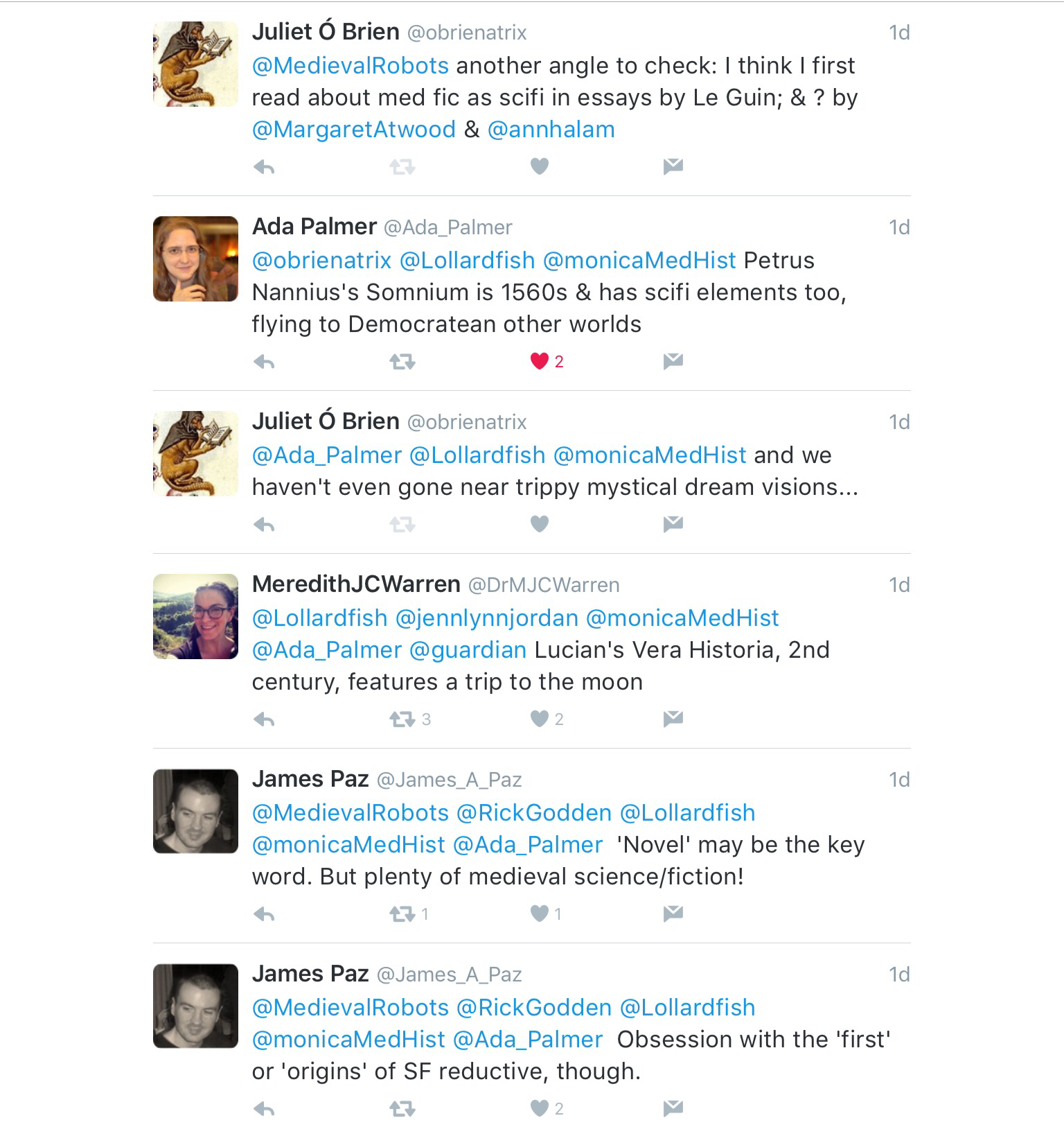 Some of those stirring are actual bona fide experts on science fiction and on medieval science fiction. For further reading, for example, there is a forthcoming volume, Medieval Science Fiction, due out with Boydell & Bewer in June and co-edited by one of the Tweeple above, James Paz: