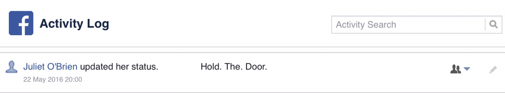 23 May at 19:35—Juliet O’Brien: SKW FB needs emojis for “OMFG my hand slipped” and “holding baby.”