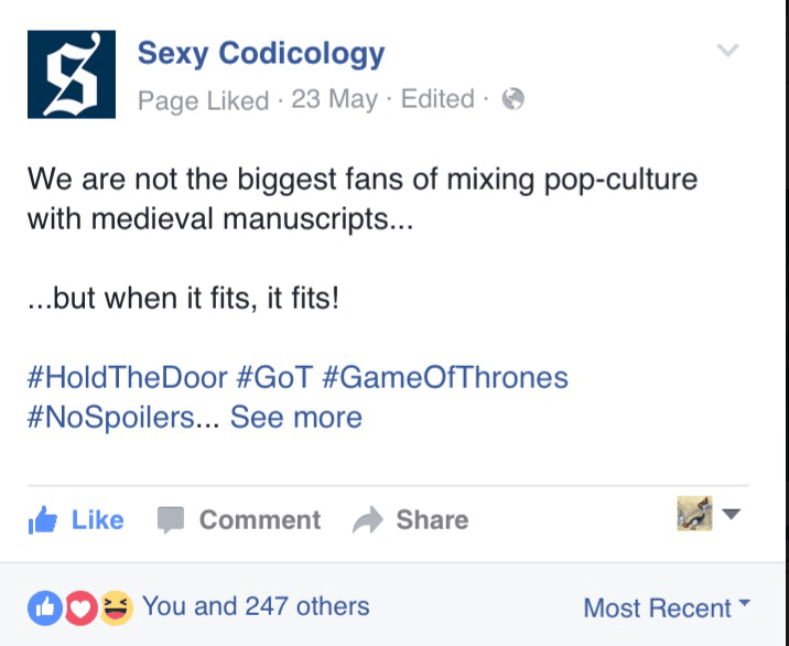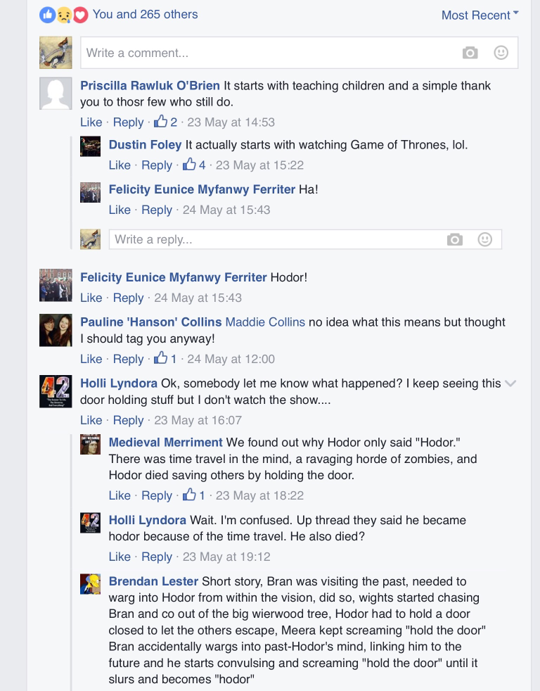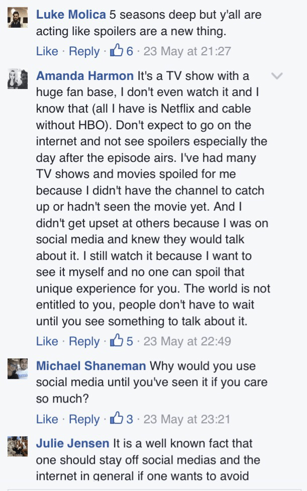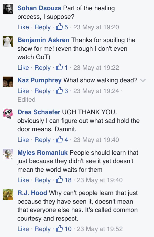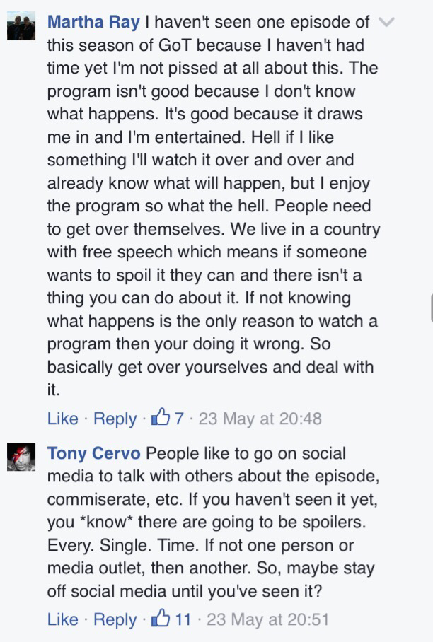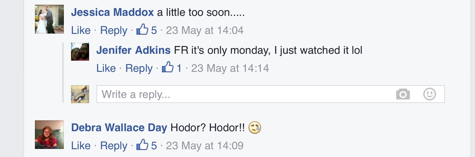 23 May at 19:35—SKW: Juliet O’Brien I think best thing to do if one *must* comment immediately is to have something totally non specific or just “read comments for GOT reaction” and then comment on your own post. That way people can choose wether or not to engage in the discussion rather than being totally bombarded just by logging on to FB.