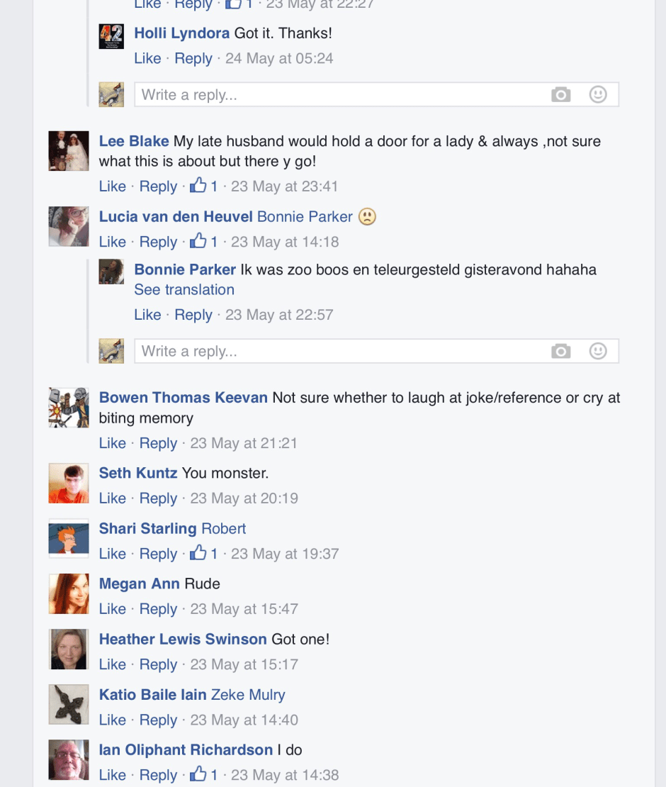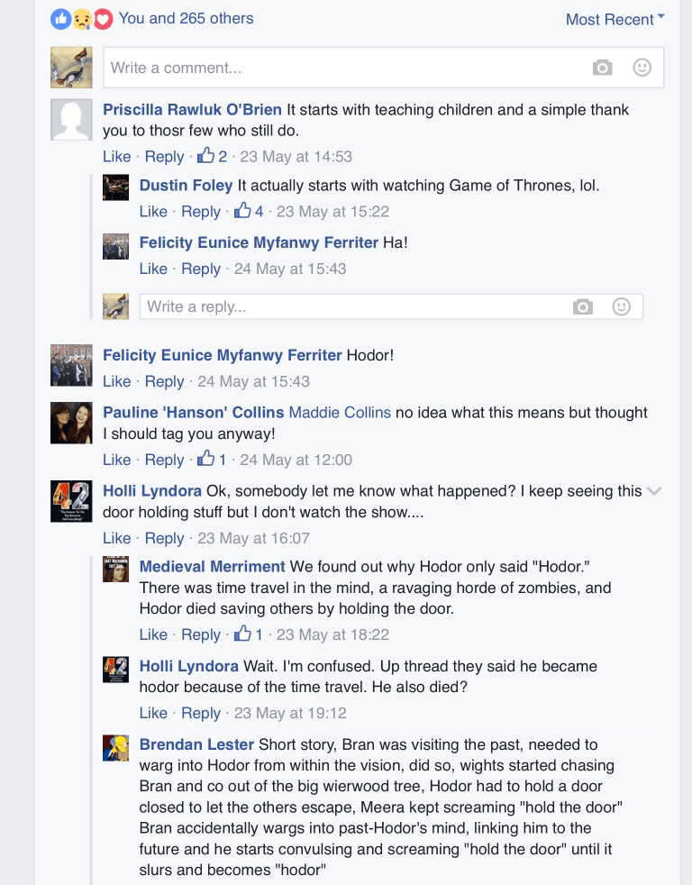 I’m not taking screenshots of all the comments and posting them here; there are over 250 of them. Many iterations of the weeping face emoticon, “the feels” and other attempts to express over-emoting, “what’s going on?” “Rude” and repeats of “Hodor hodor,” etc. Here are a few of the more interesting ones, though:
