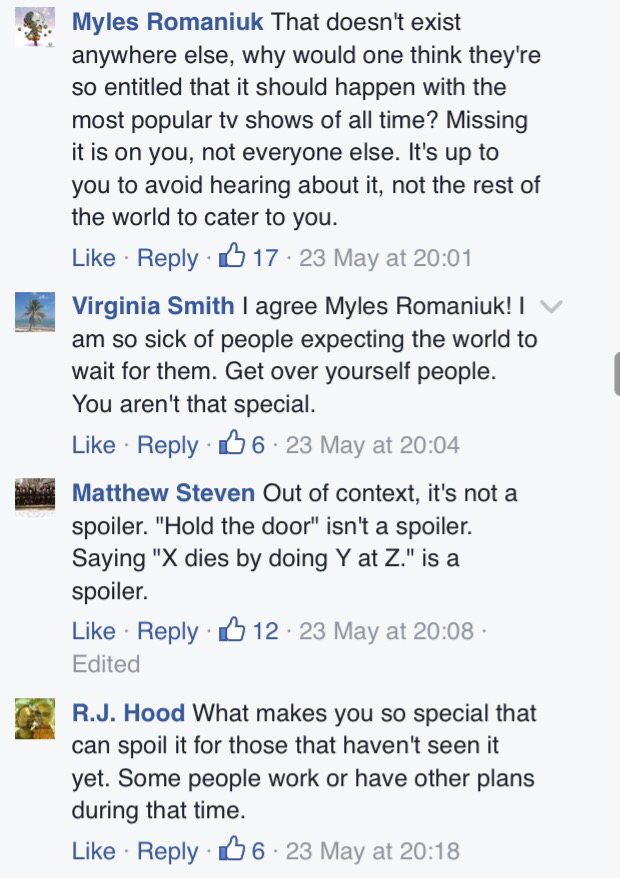 23 May at 20:36AH: Thinking that you’re entitled for the rest of the world to not talk about it before you see it is being selfish