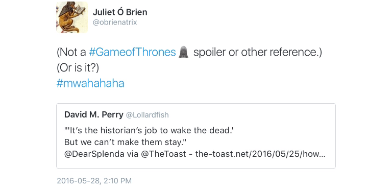 23 May at 19:30—Juliet O’Brien: SKW totally agreed: so, comment without revelation. This is new to me—first time I’m in this situation with GoT or anything else—so it’s a source of curiosity and wonder.