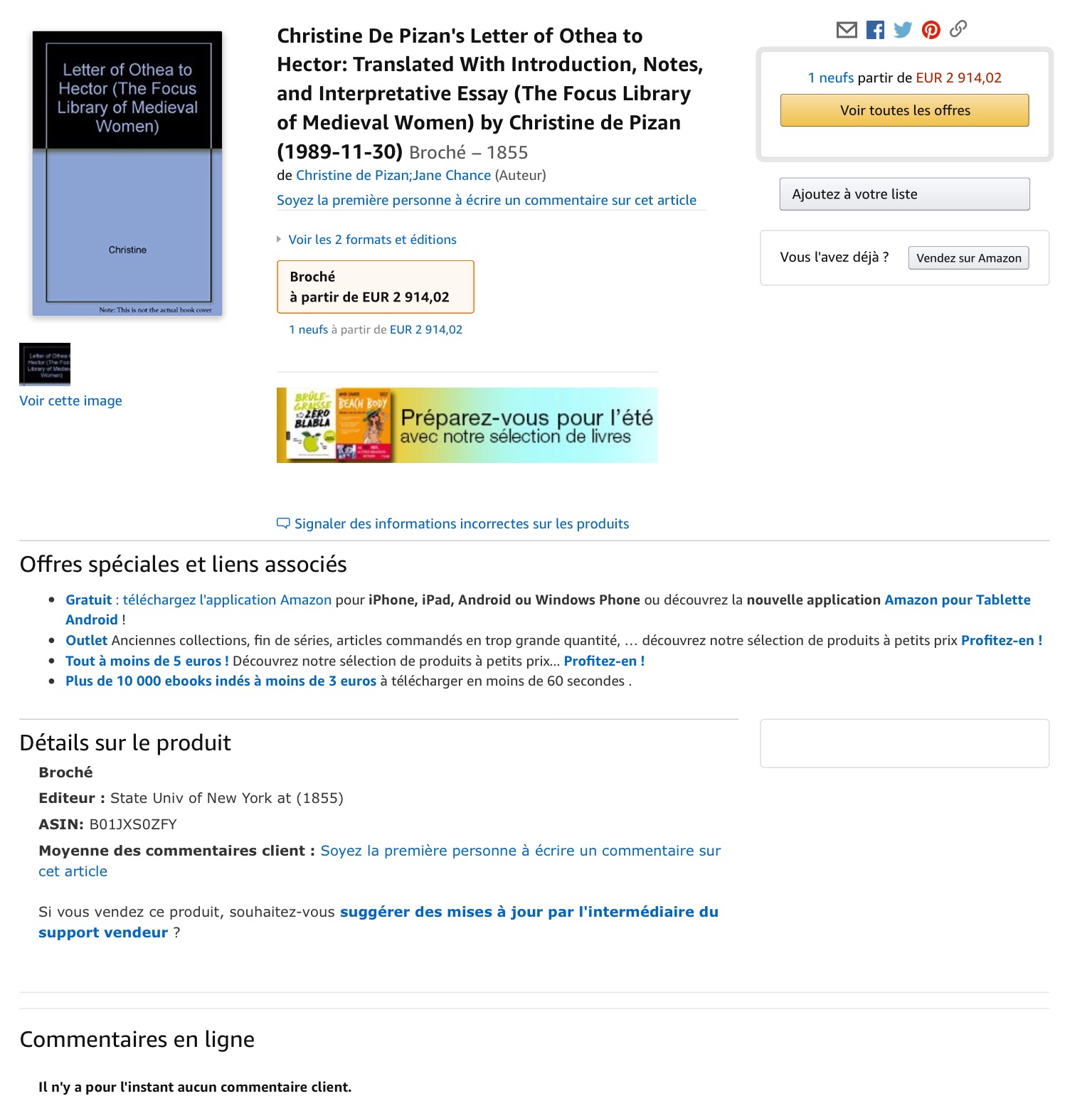 I also wrote another 800+ words, mainly complaining about the last 130-odd years’ worth of Christine editions, and the lack of decent cheap (or free) texts for students and general readers curious to read the actual original. With a lengthy excursus on the history of Christine with the Société des anciens textes français. Which WordPress failed to save. (This was probably a mercy. There was much ranting, and admiration for nineteenth-century scholarly editorial correspondence as the epitome of the high art of snark.) If you thought the situation was bad in English—some Penguin classics notwithstanding—you don’t want to look at French. Two works (one each in the decent facing-page Livre de Poche “Lettres Gothiques” and Champion Classiques) at under €15. Another two at under €25. And then there’s the expensive stuff, and then there’s the eye-wateringly piss-takingly “are you actually using this as a vehicle to sell drugs?” expensive:
