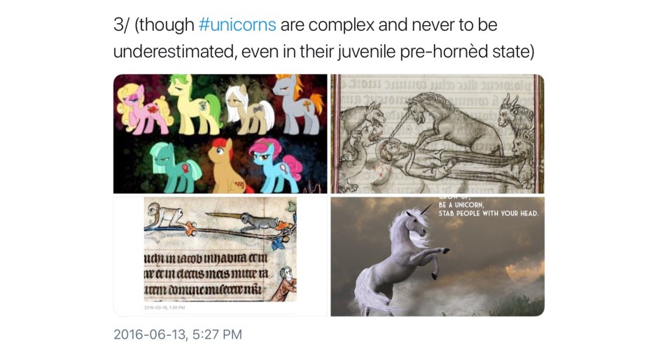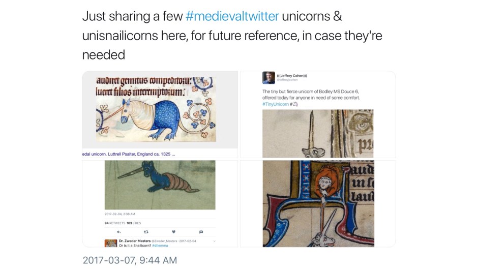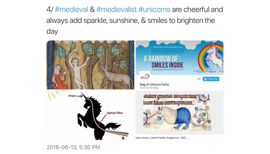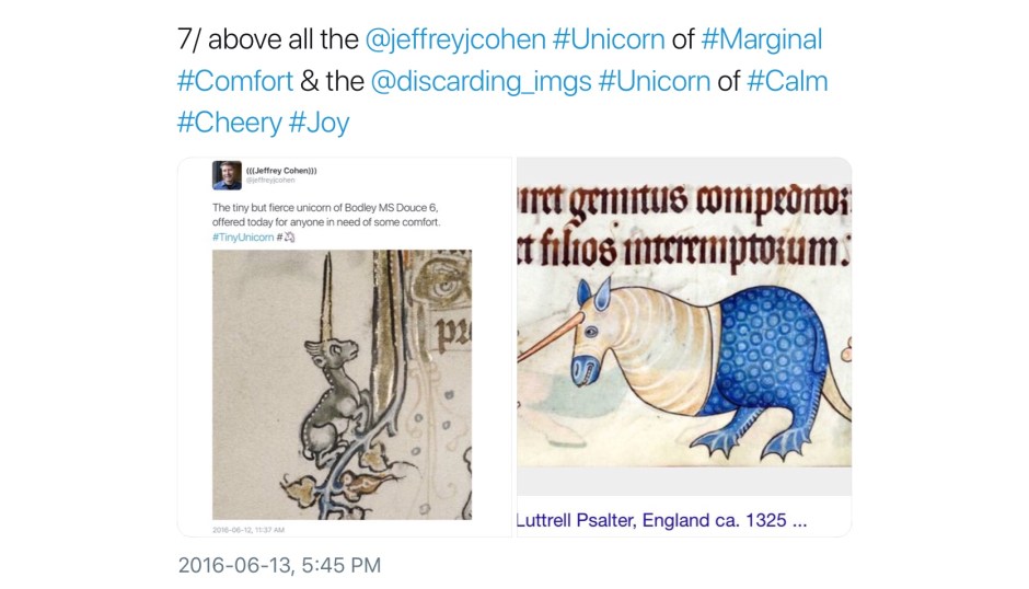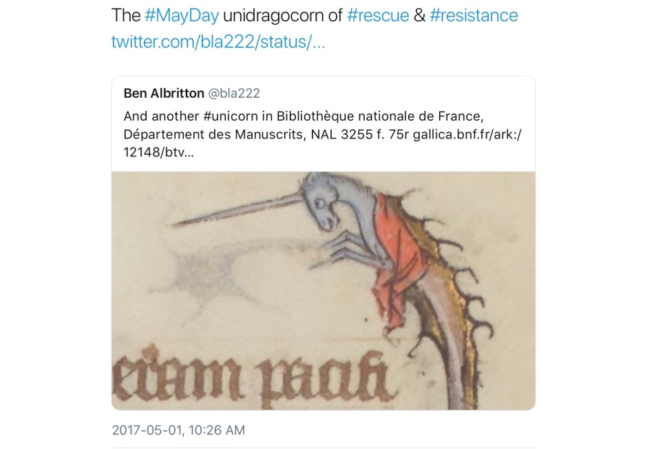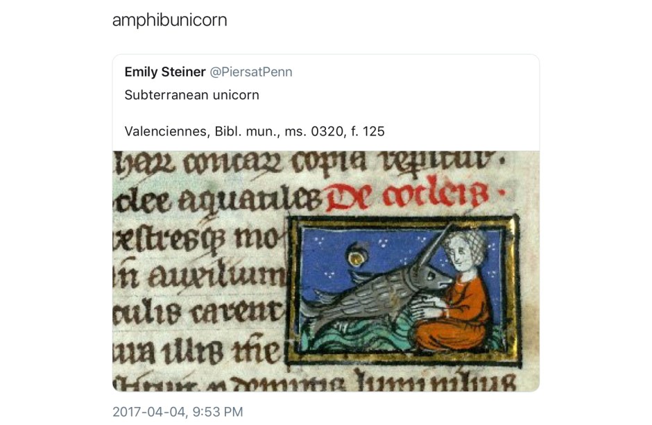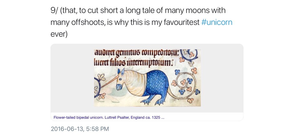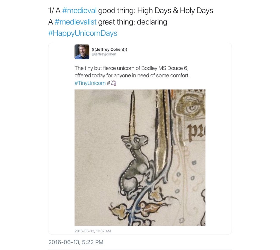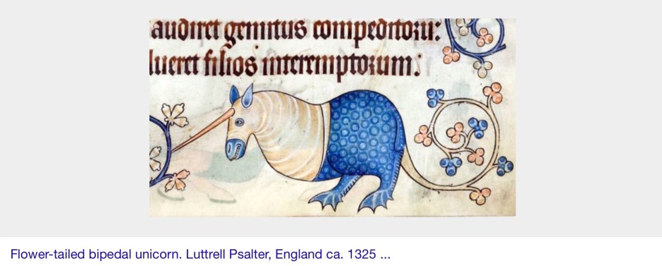 Not all unicorns are unicorns; their world is a complex one of subsets, intersections, exogamy, extended family, and kith and honorary kin. Here is a second, perhaps less obvious, collection of medieval unicorns (and a few medievalist ones). In no particular order, most were first collected in a continuing twitter thread; any comments without attribution are mine.
