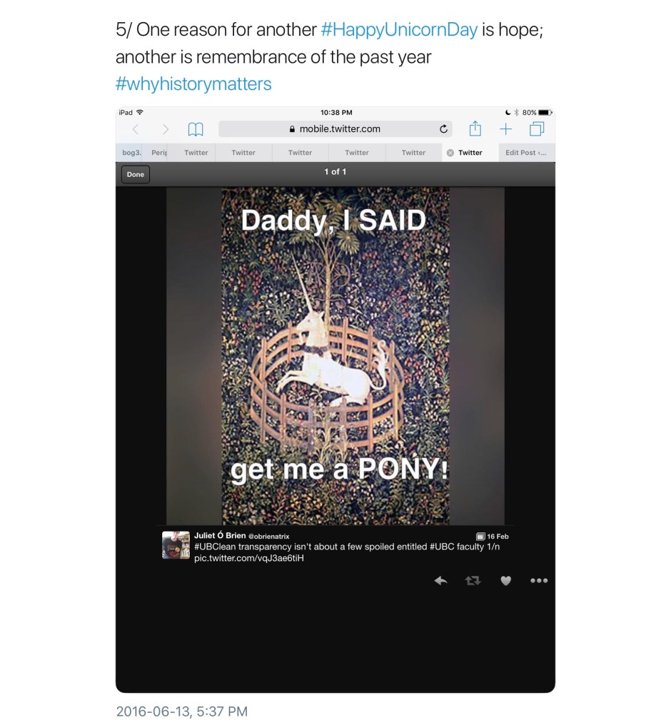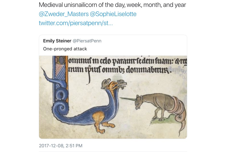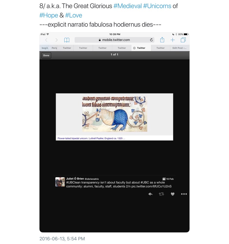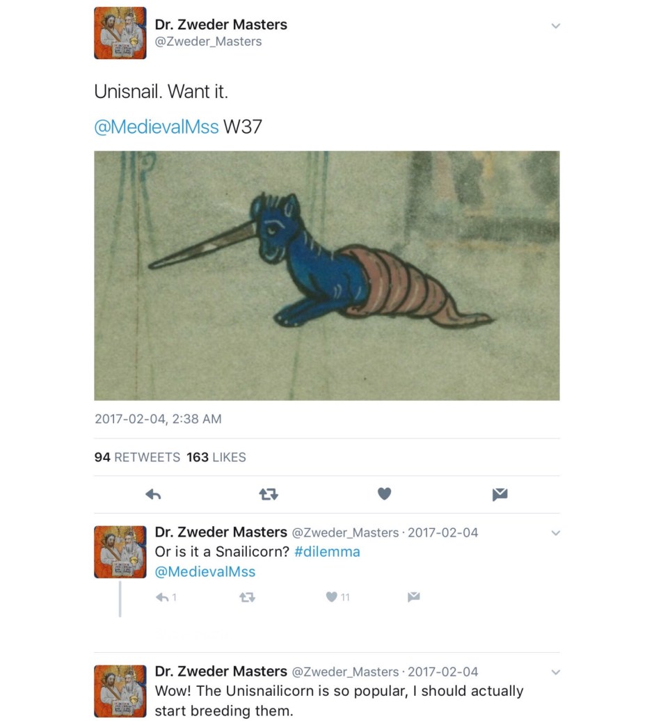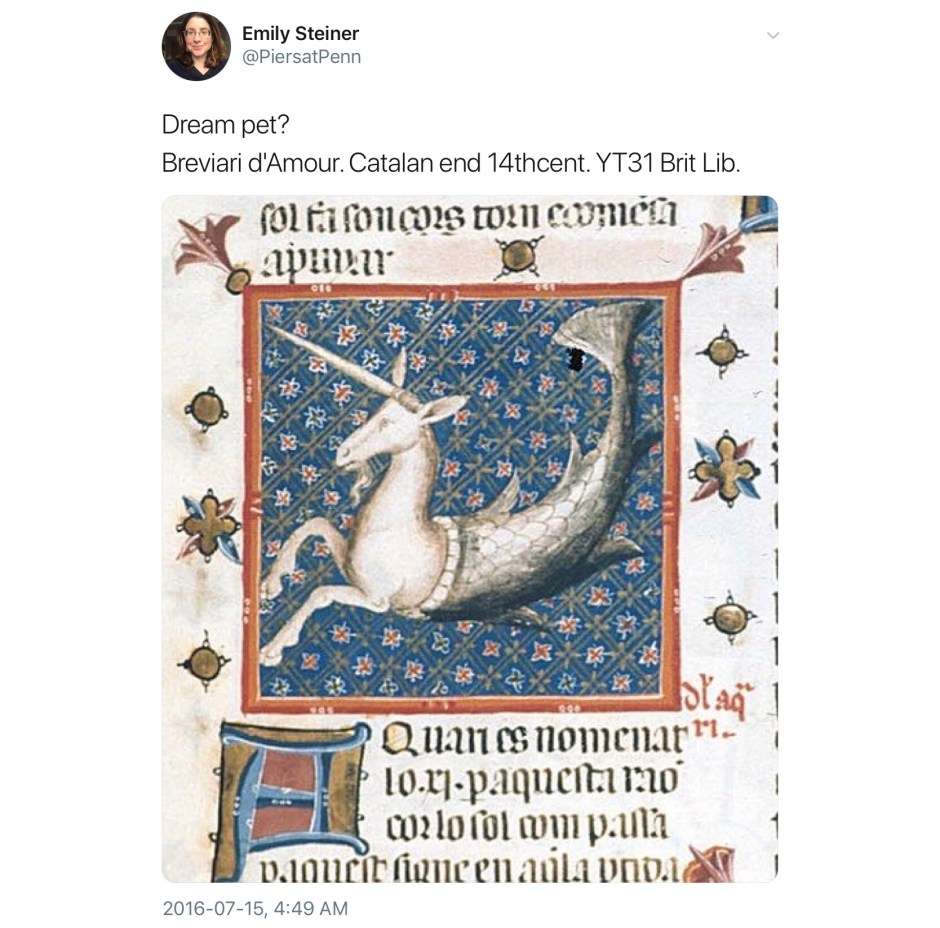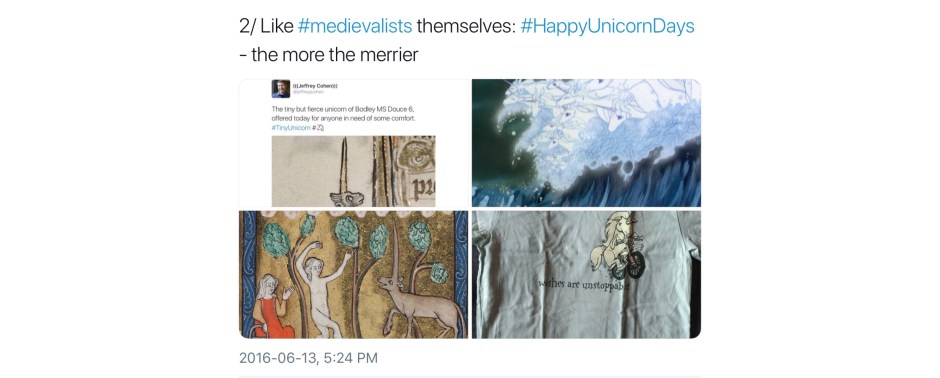 Not all unicorns are unicorns; their world is a complex one of subsets, intersections, exogamy, extended family, and kith and honorary kin. Here is a second, perhaps less obvious, collection of medieval unicorns (and a few medievalist ones). In no particular order, most were first collected in a continuing twitter thread; any comments without attribution are mine.