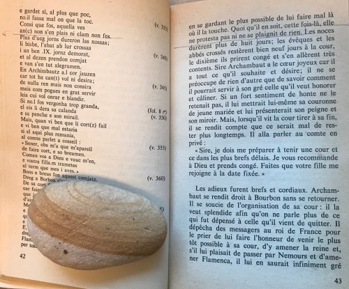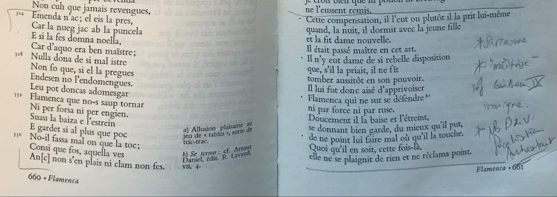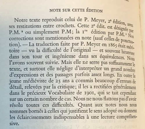 Meyer’s transcription, editions, and translation are the main base for much of the next century’s Flamenca work. Here it is in René Lavaud and René Nelli’s 1960-66 two-volume collection of Old Occitan literature; of whole works this time: