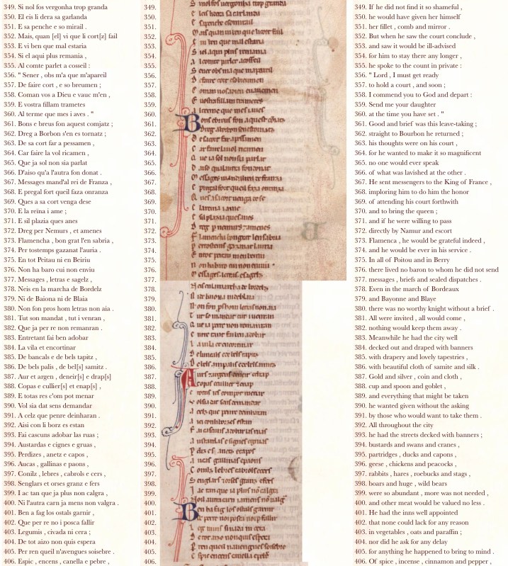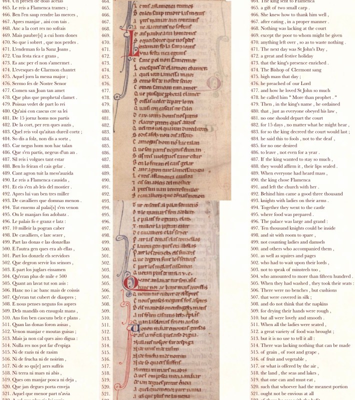 - Three-column text: Flamenca Project (Indiana University, Bloomington: Eric Beuerlein, Sandra Kübler, Michael Paul McGuire, T.M. Rainsford, Olga Scrivner, Barbara Vance) = digitised manuscript (Bibliothèque d’agglomération de Carcassonne. Ms. 34 (anciennes cotes : n° 2703 ; n° 2176) via Project Occitanica + Paul Meyer 1865 transcription & French translation + E.D. Blodgett 1995 English verse translation.