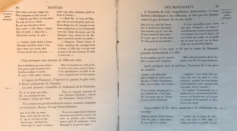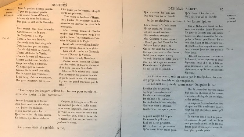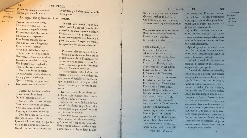 - François Just Marie Raynouard’s 1812 edition of excerpts of Flamenca appear in “Notice de Flamenca, poëme provençal, manuscrit dans la Bibliothèque municipale de Carcassonne, no. 681,” Notices et extraits des manuscrits de la Bibliothèque nationale et autres bibliothèques vol. XIII part 2 (Paris, 1827): 80-132; and in Choix de poésies originale des troubadours (Paris, 1816-21); and in Lexique roman (Paris, 1838-44).