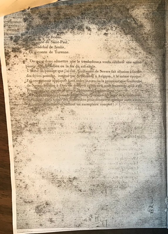 Raynouard highlights two episodes, categorised as being of major significance. The wedding feast and its list of dishes served and literary works performed is “the” Flamenca with which most readers are the most familiar, be it from meeting it excerpted in a course or in a literary collection. It’s one of the episodes that has been reproduced, analysed, and used the most by scholars over the last two centuries, as providing us with valuable historical factual information. The other is the second long list at the end of the text: a list of participants in a tournament, used to fix the date of the events recounted and to identify their protagonists: mapping them (or their pseudonyms) onto real historical persons. In notes at the end of his “Notice,” Raynouard explains the importance and value of Flamenca: