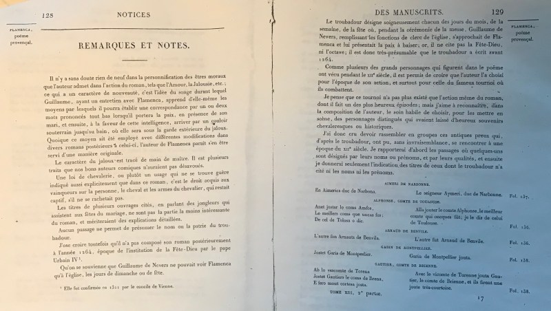 - François Just Marie Raynouard’s 1812 edition of excerpts of Flamenca appear in “Notice de Flamenca, poëme provençal, manuscrit dans la Bibliothèque municipale de Carcassonne, no. 681,” Notices et extraits des manuscrits de la Bibliothèque nationale et autres bibliothèques vol. XIII part 2 (Paris, 1827): 80-132; and in Choix de poésies originale des troubadours (Paris, 1816-21); and in Lexique roman (Paris, 1838-44).