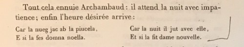 Here is the first (and main) part of François Just Marie Raynouard’s 1827 “Notice” on the Flamenca manuscript. We’ve already observed how this version, which is not a full transcription and does not purport to be one, is an incomplete account or rendering. It is worth observing what has been reduced or removed, what is skipped with a line or a short paragraph of summary—the excerpt at the top of this post is a fine example—in the modern sense of “glossing over” rather than the medieval, expansive, one of glossing; and what in contrast has been retained in its entirety and allowed to speak uninterrupted for itself.