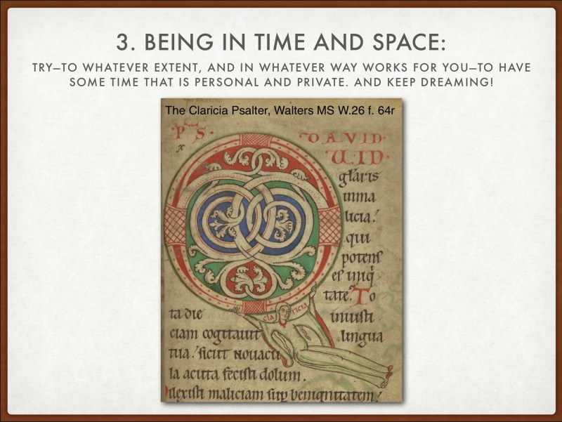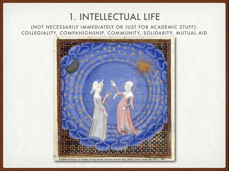 So: let’s start with intellectual life. (Including communing with the dead and imaginary of literature and ideas.) We all have support: people around you, in expanding and intersecting circles, and not just people doing the same thing as you in the same area at the same stage. Hang out. Talk about reading, thinking, ideas. Maybe also play games while doing so: I got through grad school thanks to foosball. Or board games, leisurely more physical games, whatever it is that *you* enjoy. If this talk has one Imperative Authoritative Instruction it’s this: never lose touch with joy.