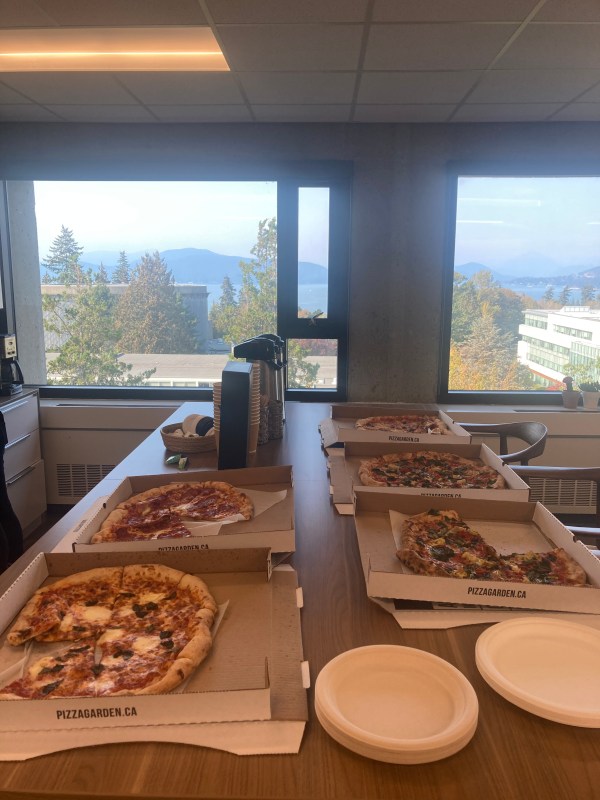 7 October 2022 – UBC Department of French, Hispanic, and Italian Studies Graduate Student Workshop: Mental Health and Academic Productivity. Magali Blanc, Juliet O’Brien, and Arturo Victoriano. Series organised by Ana Casas Aguilar. Lounge (and room next door used for workshop) courtesy of the Department. View: looking north-west towards Bowen and Gambier Islands, Howe Sound, and the mountains of Tetrahedron and Tantalus provincial parks. Pizza thanks to our Local Pizza Gods, Pizza Garden.