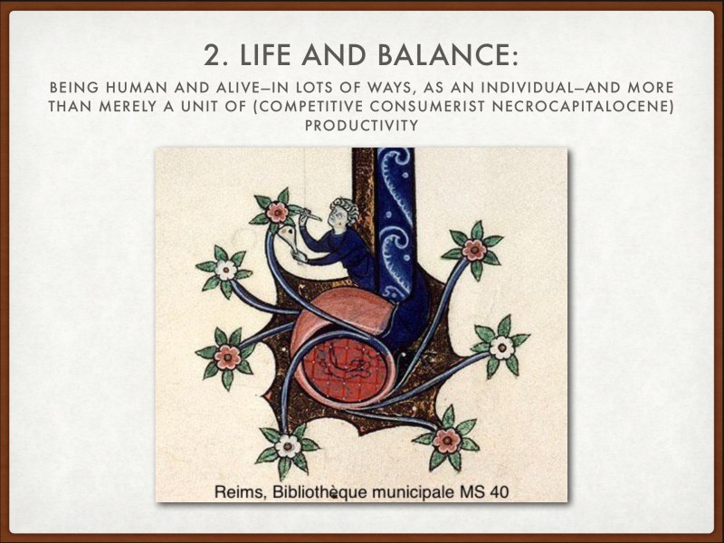 A second paradox around balance is the use and abuse of “professionalism,” and “balance” and “wellbeing,” as prescriptive normative conventions. Conventions imposed by hierarchical authorities and maintained by closing down any discussion of that convention; discussion that starts with asking questions. (That’s why we’re here today.) Questioning as curiosity, wonder, delight—and, again, joy—is a cardinal intellectual virtue. Be wary when questioning is quashed, and that includes pressure from superiors and peers to make your academic work “sound scholarly,” “neutral,” “scientific,” to make your interactions in scholarly and teaching contexts cleanly appropriate … be wary of pressures to dehumanise that work, academic and otherwise, and those interactions, and you yourself.