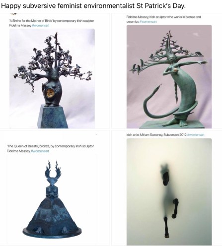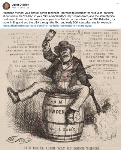 When living in the USA earlier this century, I would joke that we celebrated St Patrick’s Day by fighting with English people. Living in the UK in the 1990s as an Irish person, this was a joke and not a joke; therefore the most Irish and best kind of joke. I’m not going to footnote it with references to contemporary political history, or to the twentieth century’s longer history and to four centuries’ continuing socio-cultural prejudices and xenophobia. Relatives tell me that it’s worsened with Brexshite and the rest of the right-wing turn.