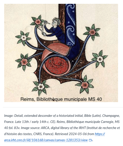 The idea of the chapter was central: capitulum, a botanical flower-head, and its use in a book; especially, in the medieval French aspect of our course, “the” book that is the Bible, as exemplified by our course image in its culturally-characteristic creative subversion. Caput: a head; and as a singular group-noun, an ecclesiastical body, an assemblage of human heads adventuring together mindfully on a shared quest. Chapiter, a capital: the architectural sense of 3D features that connect the ground to the air and verticals to horizontals, support arches, look outwards in all directions, are ornamented and historiated, have amusing details that maybe no-one can see or at least not for centuries (except the maker way back when), and might once have been gaudily painted but all the colour flaked off with time and then the goddessesforsaken Victorians (and their French imperial analogues) rethought them as being nice and clean and white. Make philology great again: return the obscenity of contemporary “capitalism” to its original heady capital.