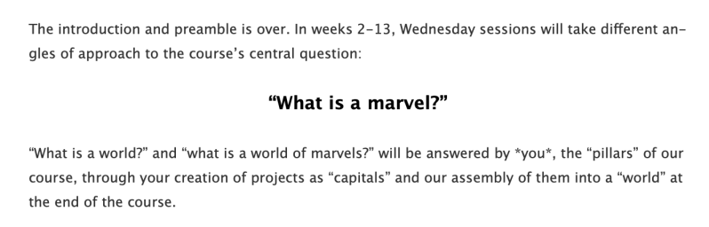 – the project itself: make a marvel (form: anything except the standard academic essay or final paper), including a close reading of your own marvelling, and share it in a student community online exhibit