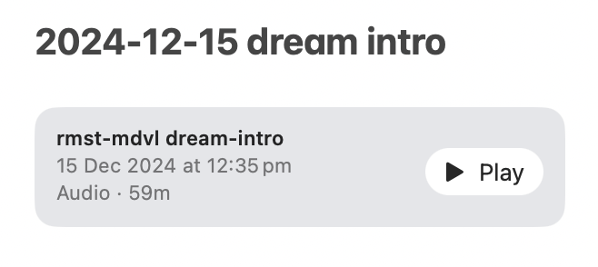 Friday 13 December: exam (another, unrelated, course). That night and the next one, I sleep a lot; the traditional cyclical December crashing, body-enforced rest, and recovery. I wake up around noon on Saturday 15 having had a vivid dream about teaching the first class. It’s very clear and detailed. I know that I can’t write it all down fast enough, so I record it. At nearly an hour long, it’s the perfect length for an 80-minute class. I’m tempted to play this to my students in our first session.