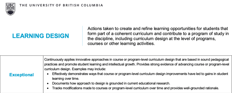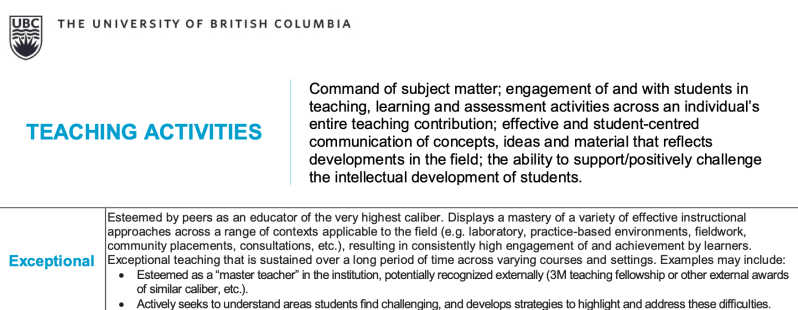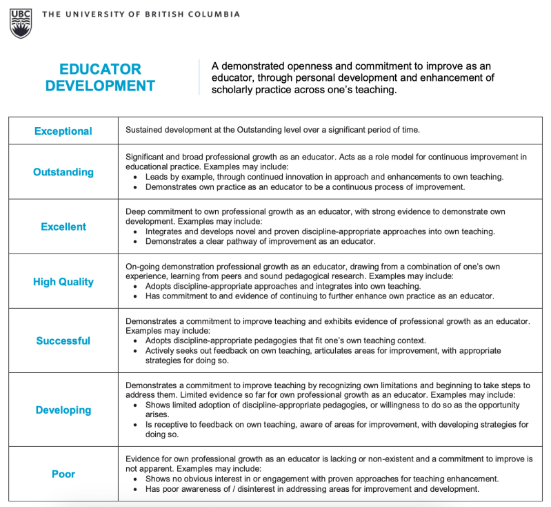 At the University of British Columbia, summative peer review is an established practice in the overall evaluation of teaching. Faculty members typically participate in both formative and summative peer reviews of teaching as part of their career progression and growth. […] The formative peer review of teaching (PRT) is a process intended to support instructional growth and collegial conversations about teaching, as well as enhance student learning. In the PRT, peers may provide feedback on various elements of teachings [… including] Self-assessment documentation such as a teaching portfolio. Peer review of teaching, when focussed on growth and development, is a reflective and collaborative process in which the instructor under review works closely with a colleague or group of colleagues to discuss teaching. Though the process outlined [… ] is unidirectional (i.e., a reviewer giving feedback to an instructor), we highly encourage you to consider a reciprocal peer review process where instructors observe each other’s teaching, reflect on what they learned through the observation, and share feedback […] individual reflection on, and inspiration for improvement in, one’s own teaching.