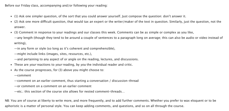 - It’s much more interesting for all of us for students to come up with their own questions and to discuss these questions and their choices; compared to punitive quizzes, it’s a better faster way to get students to read closer and deeper and broader to spur each other on, peer pressure and light friendly competition (like a game, I mean a proper fun game not the kind about point-scoring and winning), building community expectation, co-creating a class community: which is the crucial element that changes a course into an actual class proper.
